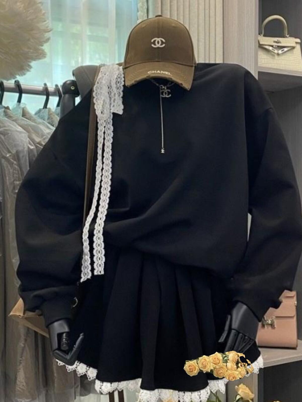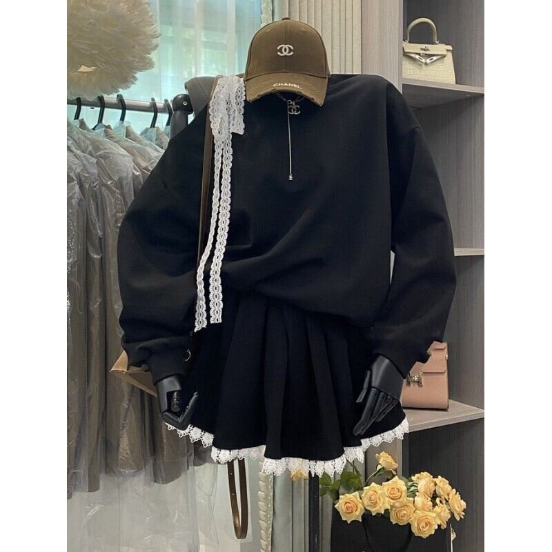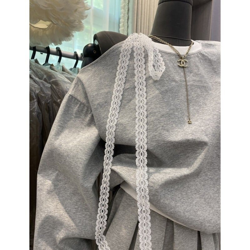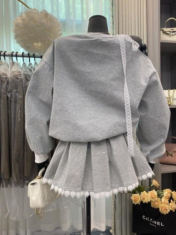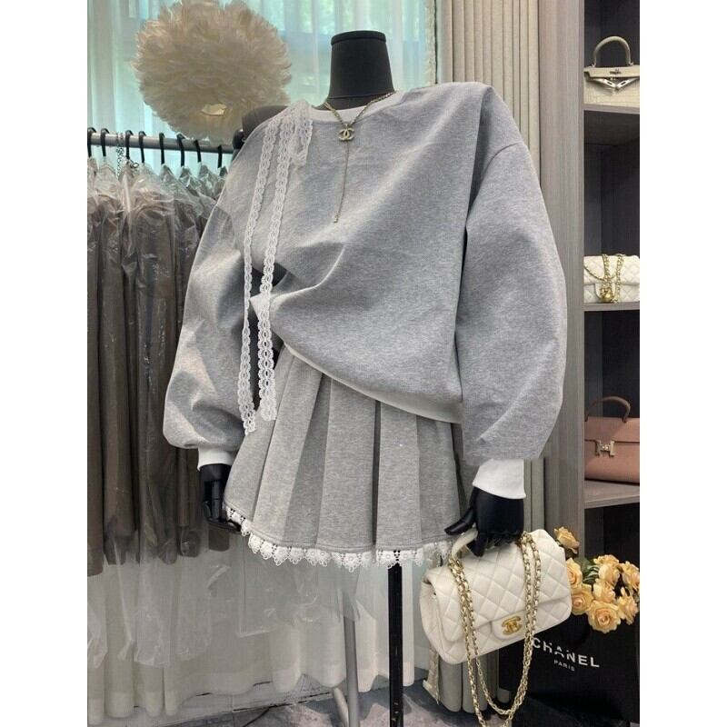 セットアップ レディース スカート トップス トレーナー フレア プリーツスカート ミニ 膝上 長袖 ドロップショルダー クルーネック ワイド プリーツ リボン かわいい 大人可愛い おしゃれ エキゾチック こなれ感 個性的 クール 主役級 存在感 無地 春 秋 冬 ロングシーズン 通勤 デート お出かけ 旅行 女子会 韓国 オルチャン 美脚 脚長 普段使い 着回し M L XL 2XL 大きいサイズ 黒 ブラック グレー