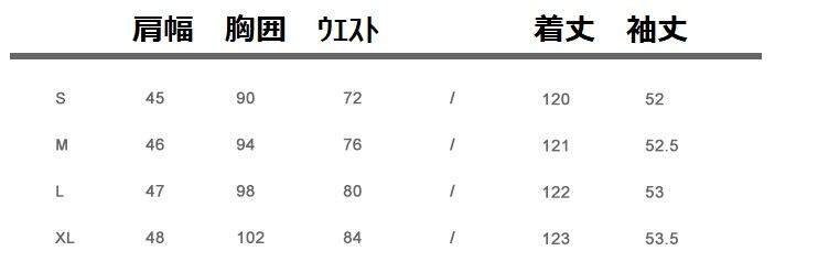 L:着丈122 肩幅47 バスト98 ウエスト80 ヒップ102 袖丈56