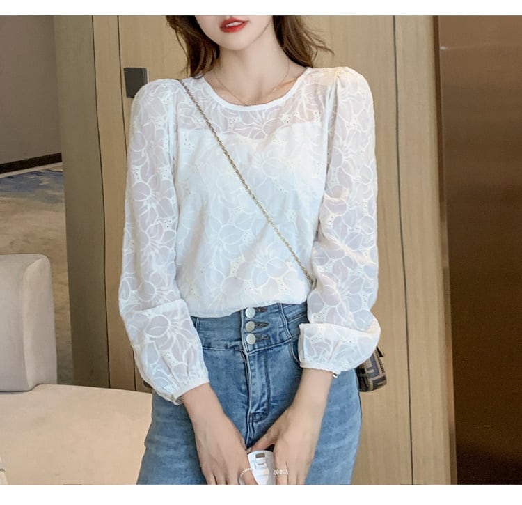 ブラウス レディース トップス シャツ 白シャツ 透け感 長袖 ラウンドネック 花柄 刺繍 花 かわいい 可愛い 日常 普段着 普段使い 仕事 仕事用 仕事着 20代 30代 春 夏 シンプル カジュアル 大人 ファッション コーデ コーディネート 韓国 オルチャン お取り寄せ 送料無料 hll-0487