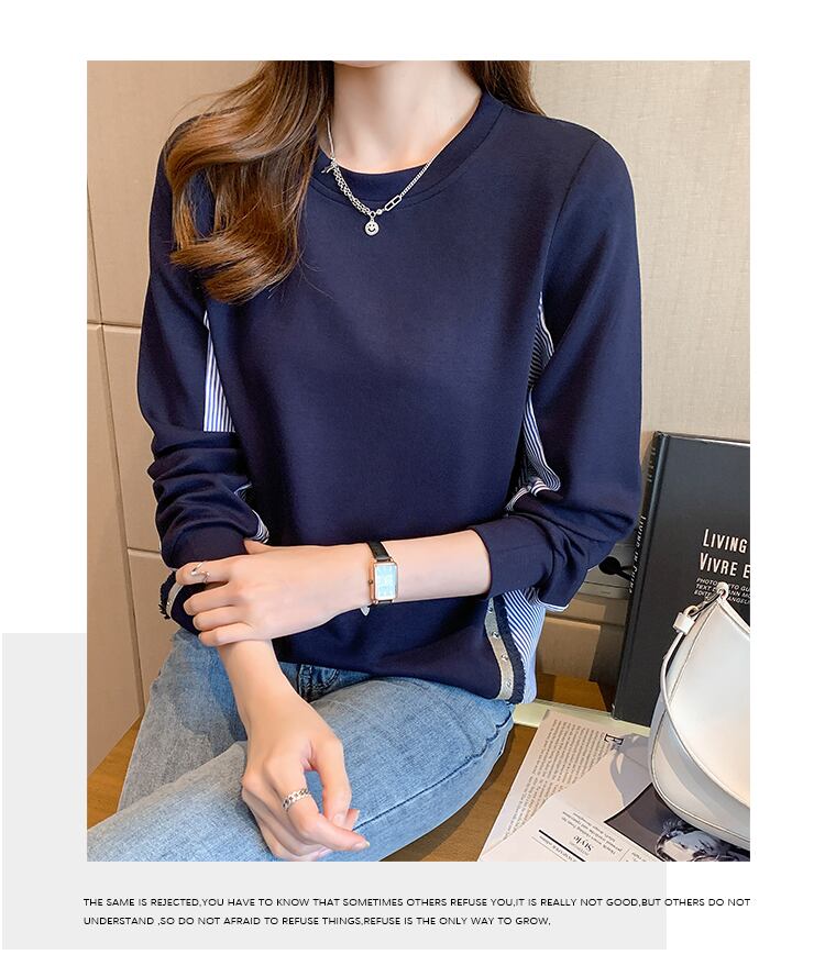 切り替えプルオーバー カットソー レディース トップス 長袖 ラウンドネック ストライプ ボタン かわいい 可愛い カジュアル 通勤 お出かけ 女性 デート アシンメトリー アシメ デザイン 20代 30代 40代 春 秋 ネイビー 大人 コーデ コーディネート 韓国 ファッション オルチャン お取り寄せ 送料無料 hll-0492