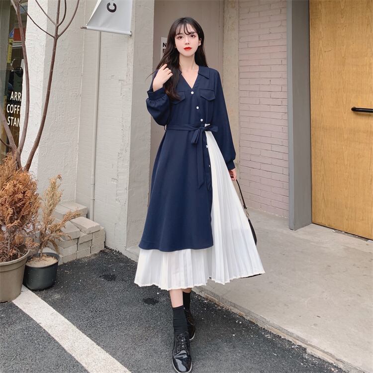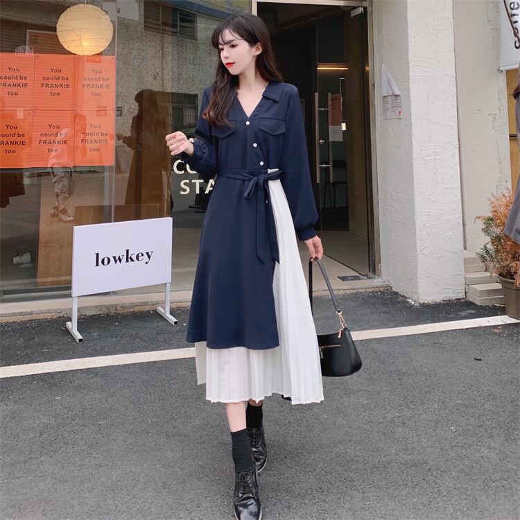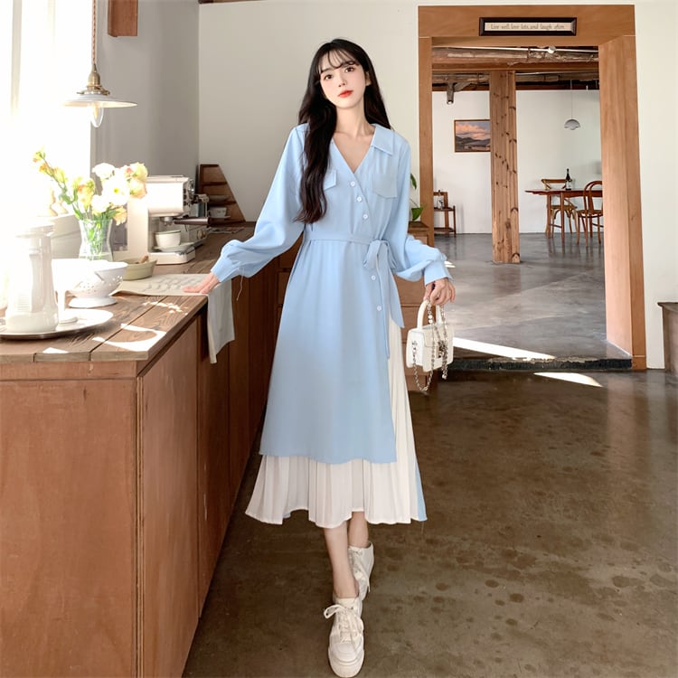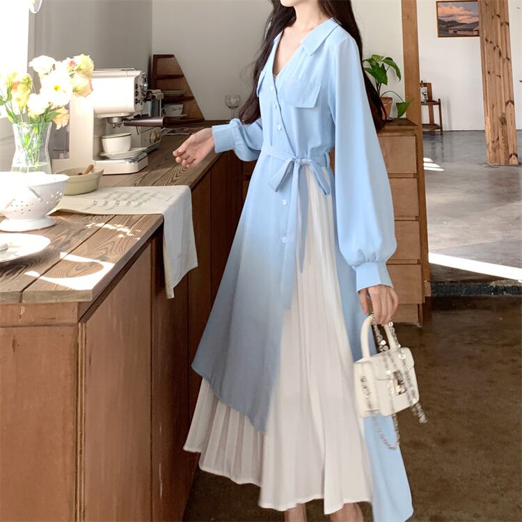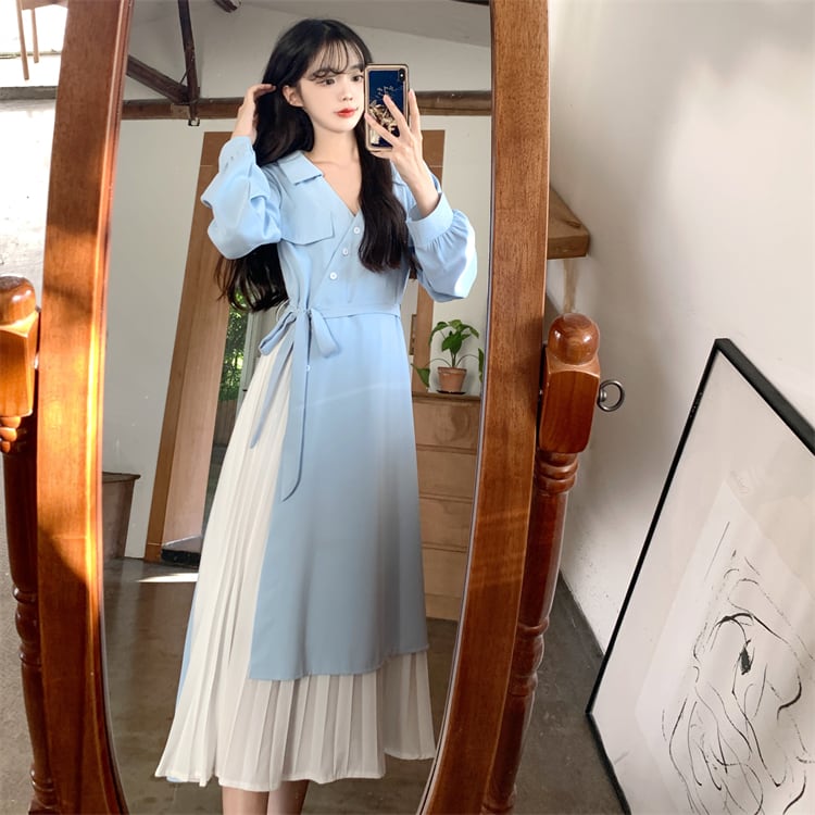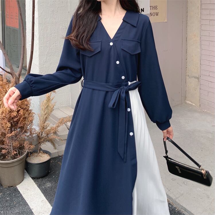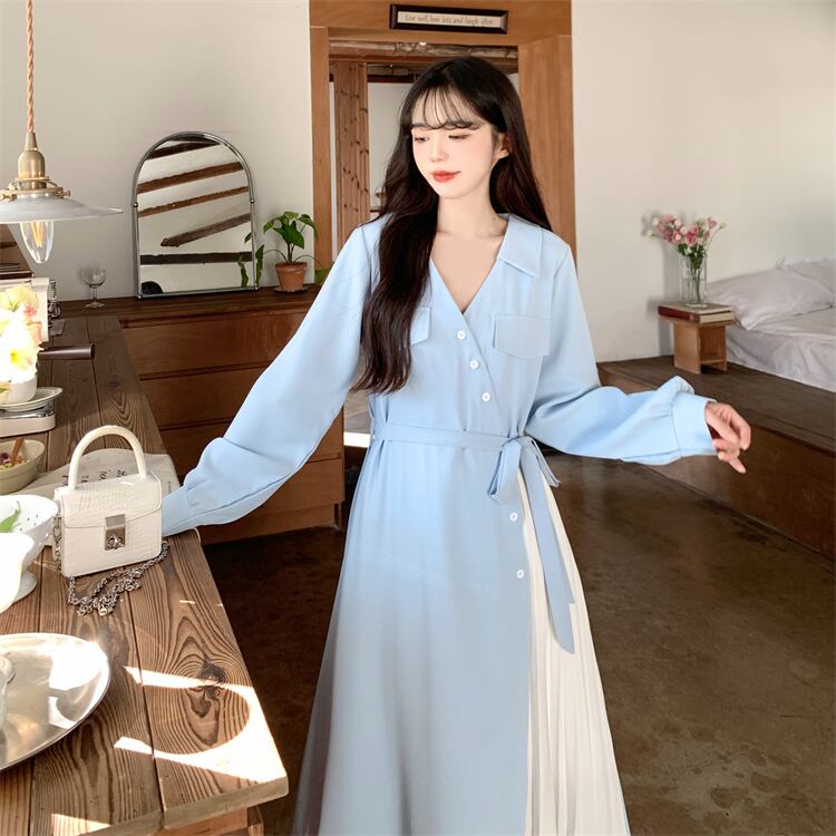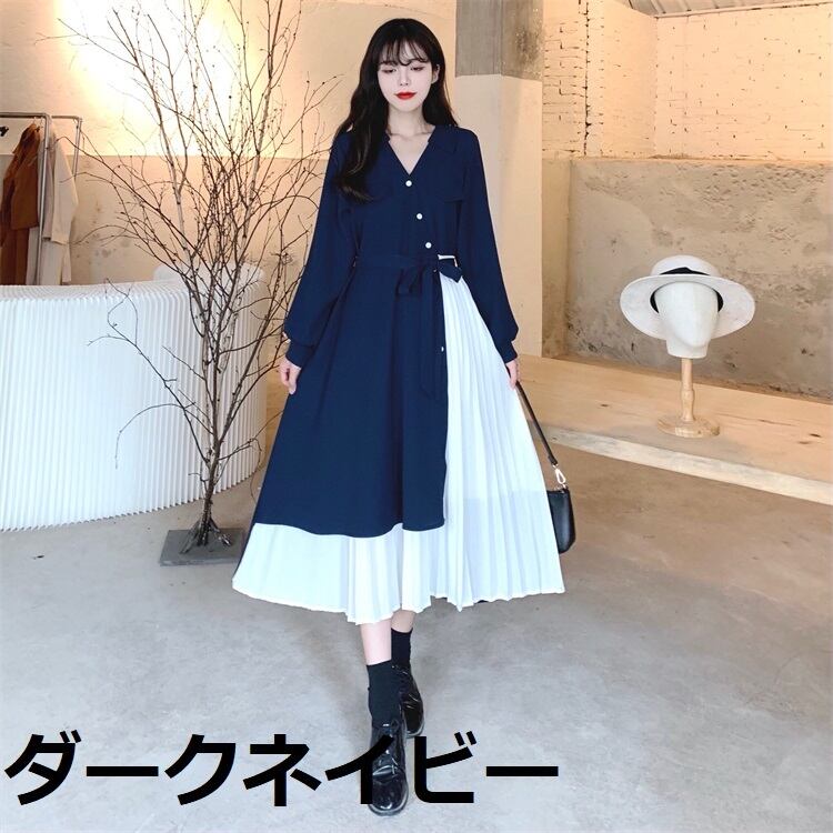 ロングワンピース レディース ワンピース 長袖 vネック アシンメトリー アシメ デザイン プリーツ スカート ロング かわいい 可愛い 日常 デート お出かけ フェミニン ガーリー 春 秋 青 大人 コーデ コーディネート 韓国 ファッション オルチャン お取り寄せ 送料無料 hll-0500