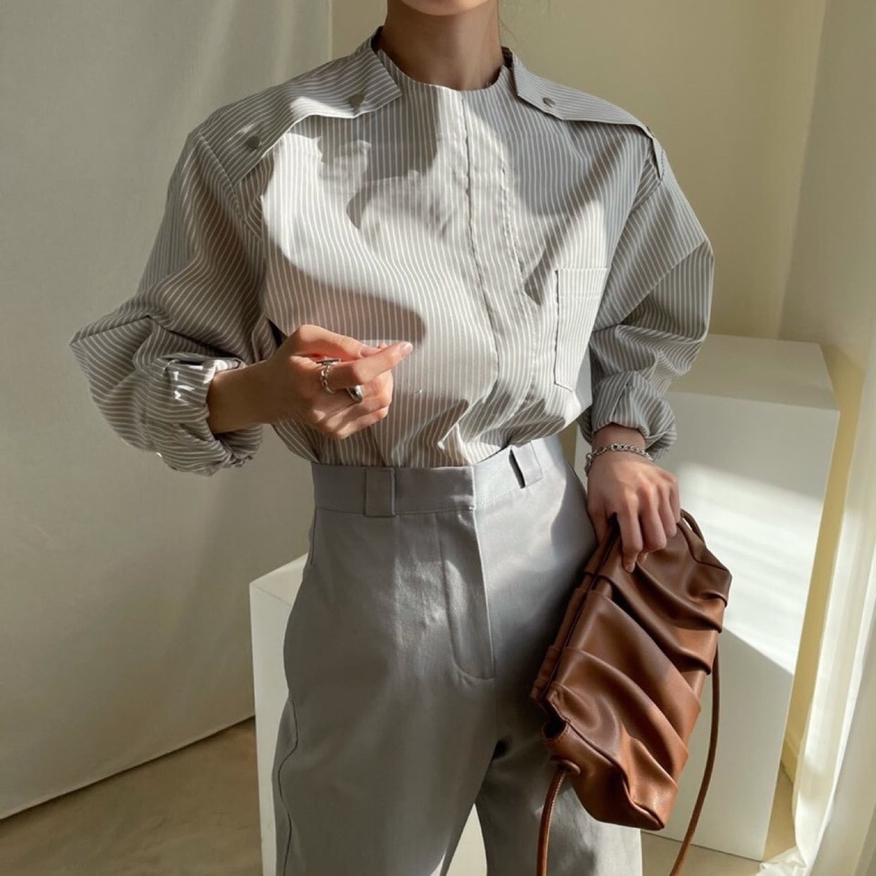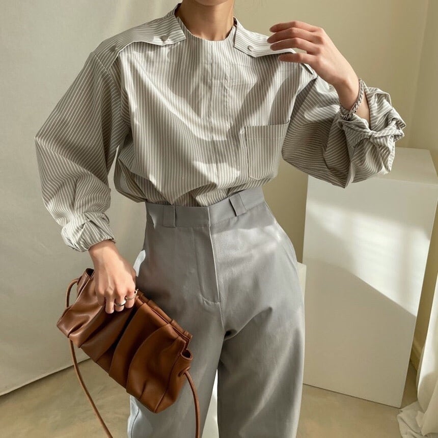 スタンドカラーが大人っぽいストライプシャツ。