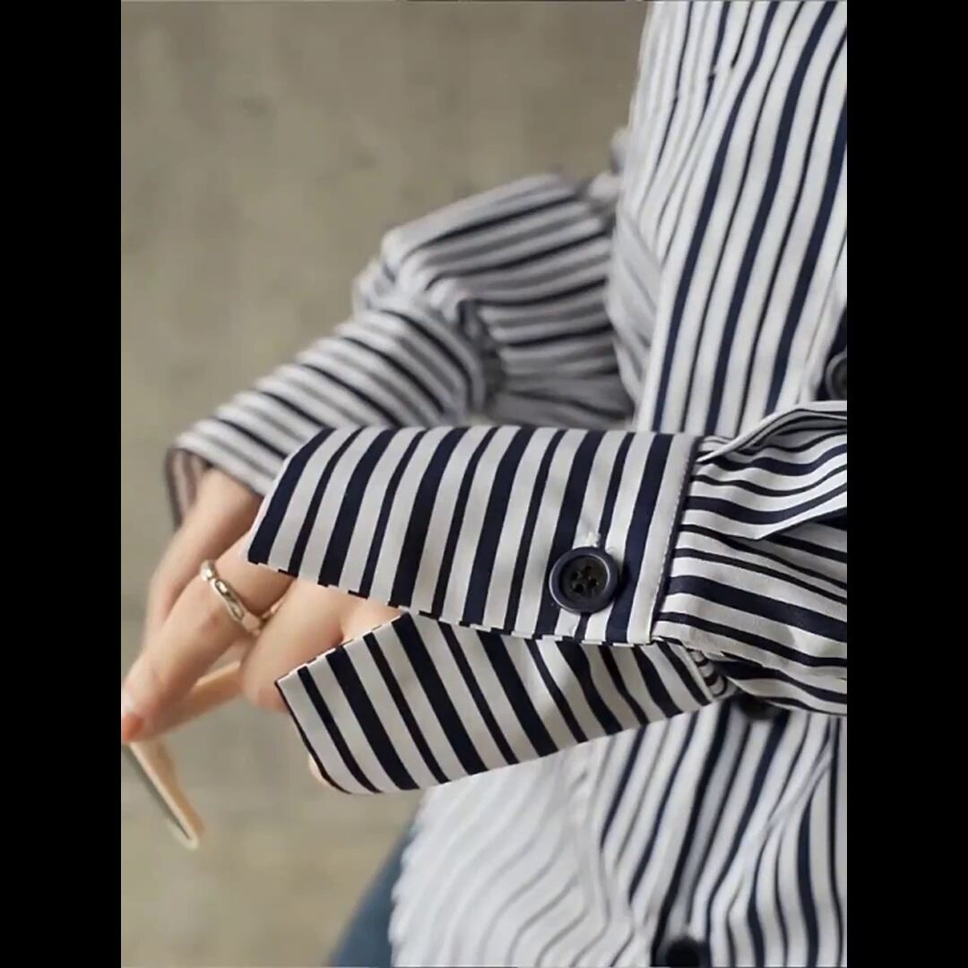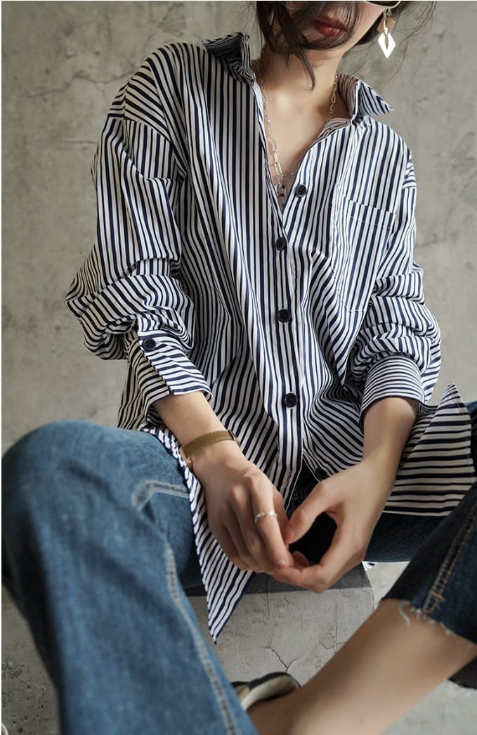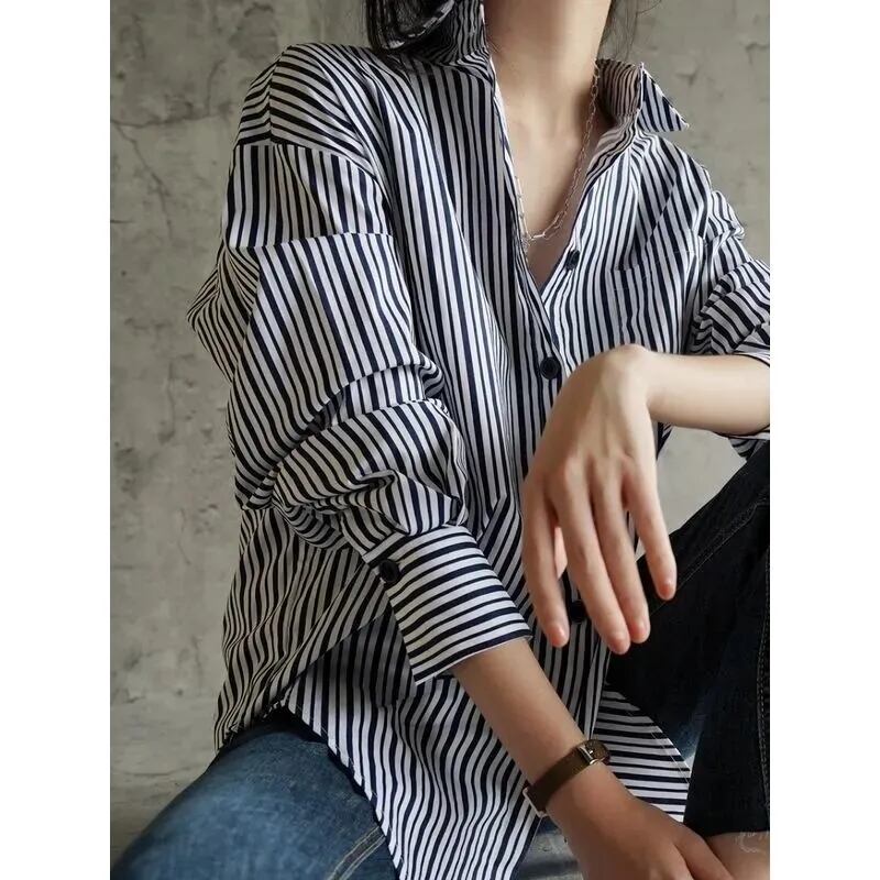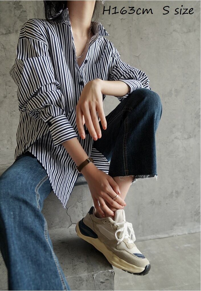 ストライプシャツ レディース トップス シャツ バックスリット ストライプ 長袖 ポロ襟 シック アシンメトリー アシメ デザイン カジュアル カッコいい クール きれいめ オフィス ビジネスシーン 仕事 仕事用 仕事着 20代 30代 40代 春 秋 大人 コーデ コーディネート 韓国 ファッション オルチャン お取り寄せ 送料無料 hll-0515
