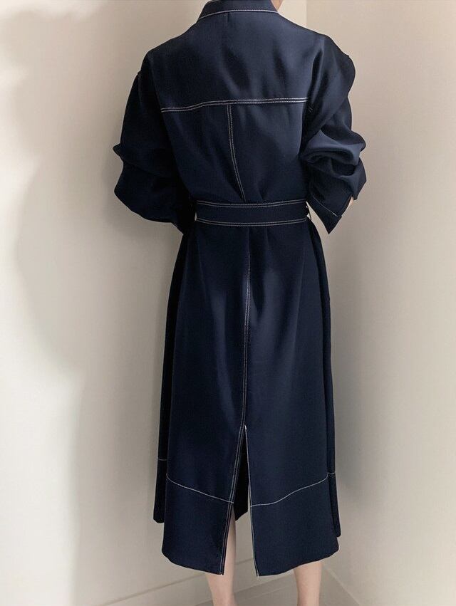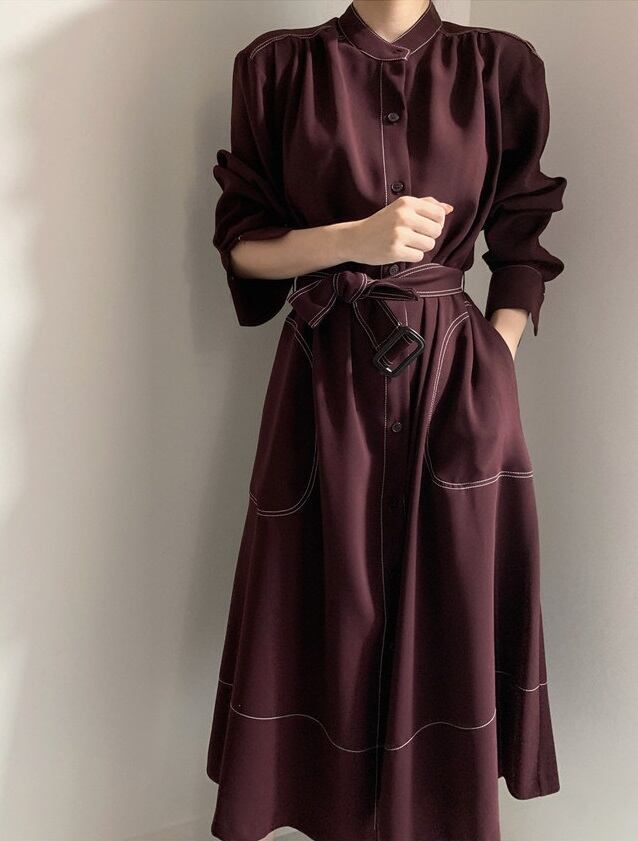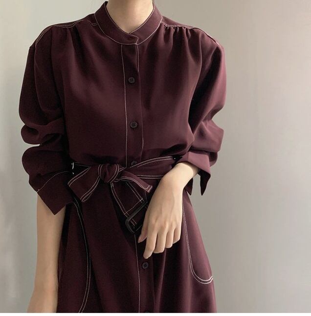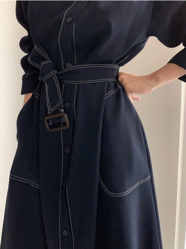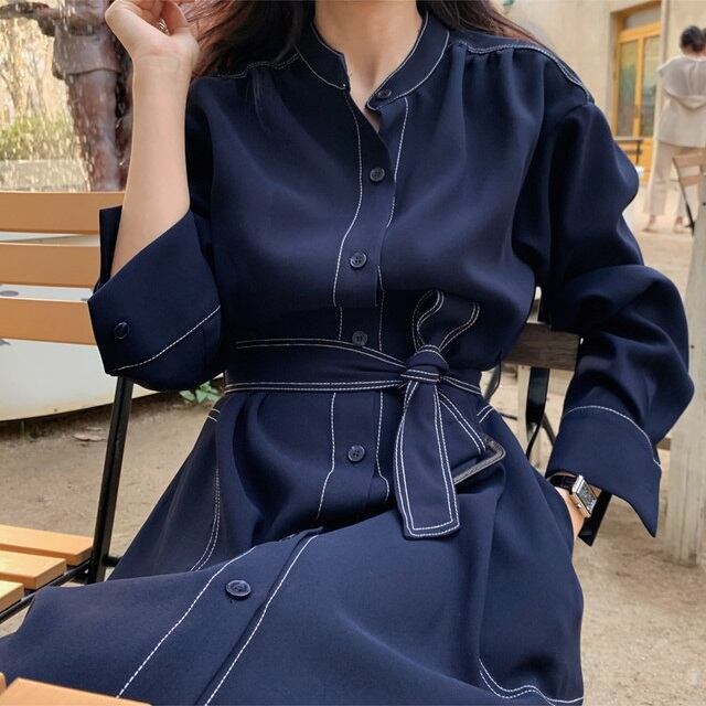 シャツワンピース ミドル丈ワンピース ハイウエスト 大人 コーデ コーディネート 韓国 お取り寄せ 送料無料 hll-0053