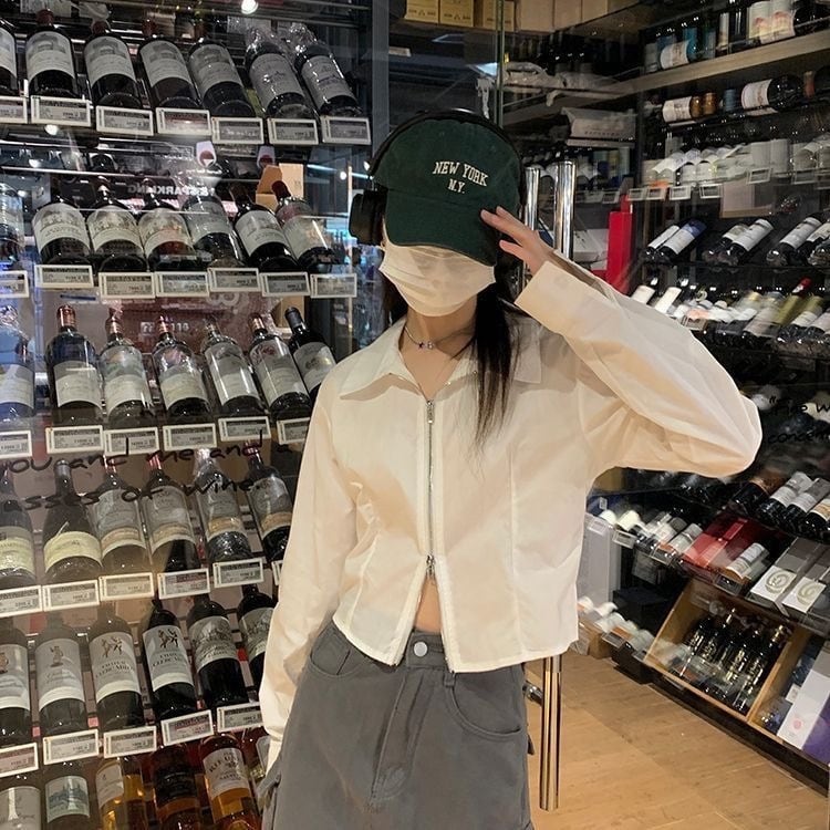 クロップドシャツ クロップド丈 ショート 白 シャツ 無地 長袖 ダブルジッパー ポロ襟 日常使い 普段着 普段使い 大人 コーデ コーディネート 韓国 ファッション オルチャン お取り寄せ 送料無料 hll-0535