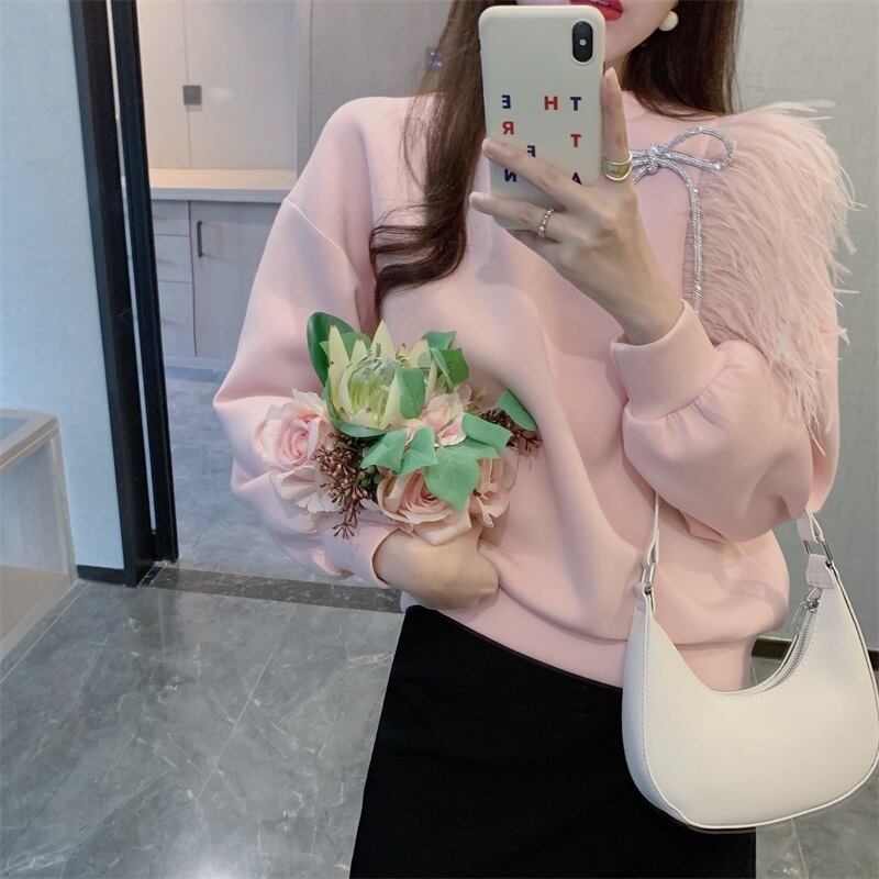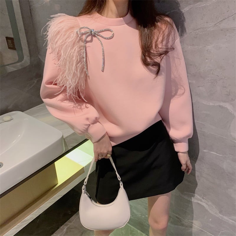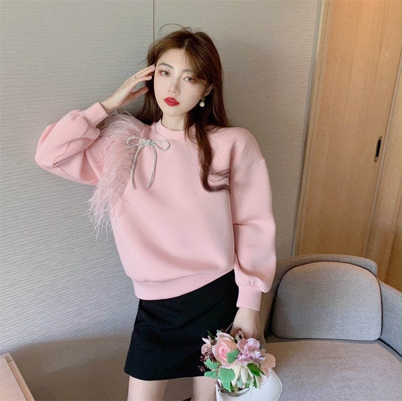 プルオーバー 長袖 スウェット ピンク ファー ふわふわ ラウンドネック レギュラー丈 リボン フェミニン ガーリー ファッション 大人 コーデ コーディネート 韓国 オ ルチャン お取り寄せ 送料無料 hll-0541