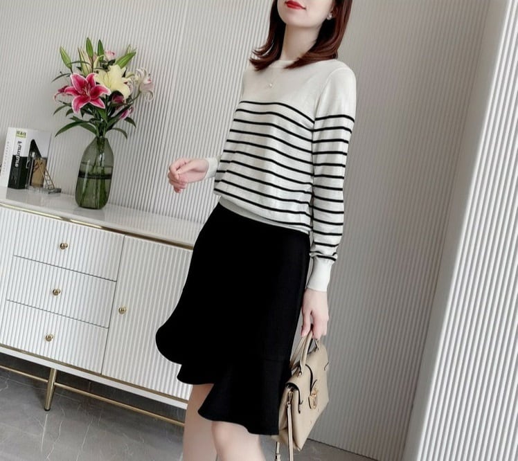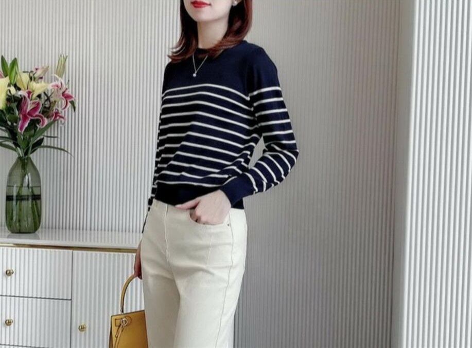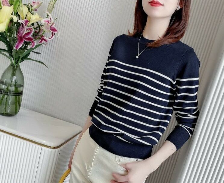カットソー ニットソー ボーダー 長袖 ラウンドネック シンプル ネイビー ホワイト 白 春 秋 ファッション 大人 コーデ コーディネート 韓国 オルチャン お取り寄せ 送料無料 hll-1252