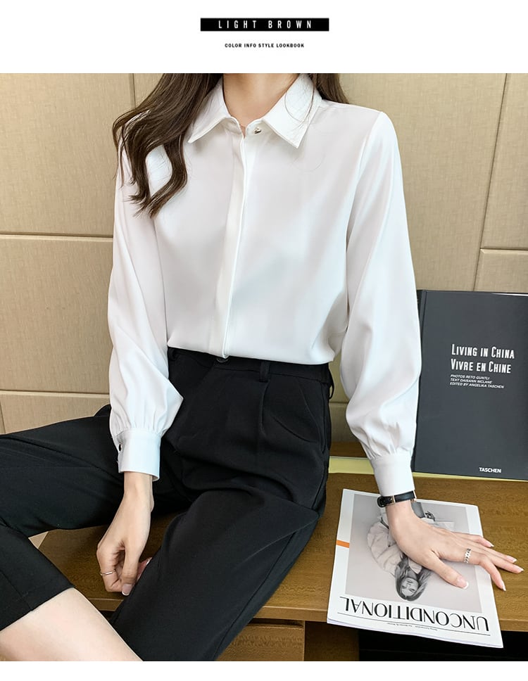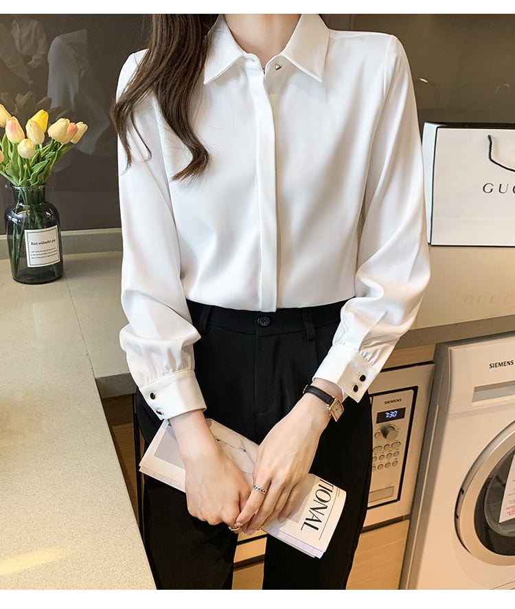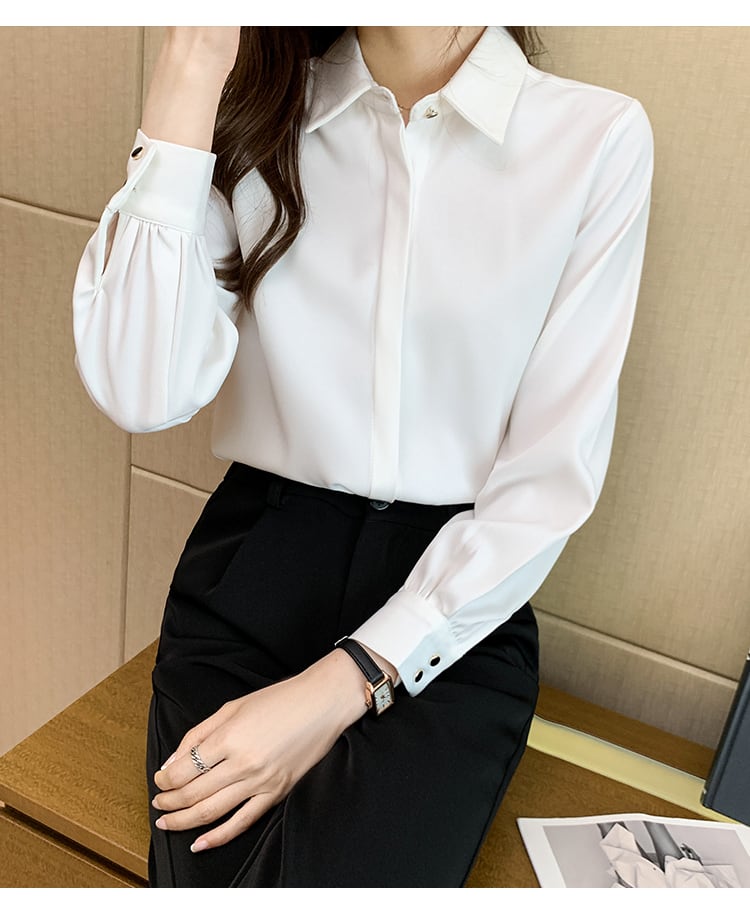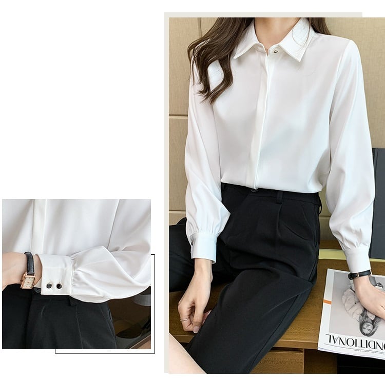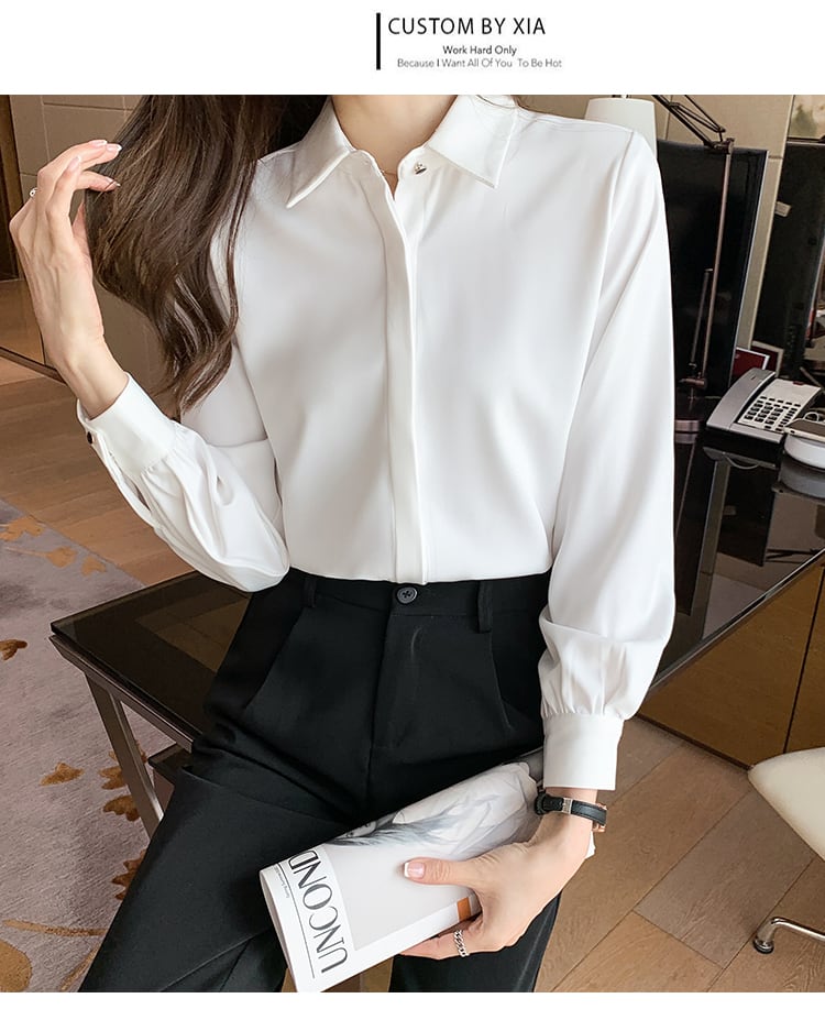 長袖シャツ シャツ 無地 ポロ襟 カジュアル フォーマル レギュラー丈 きれいめ 仕事 仕事用 仕事着 エレガント きれいめ 白 ホワイト 大人 コーデ コーディネート 韓国 ファッション オルチャン お取り寄せ 送料無料 hll-0539