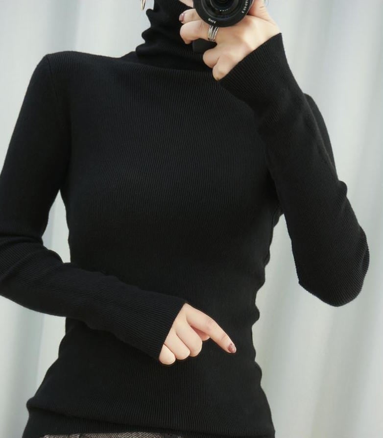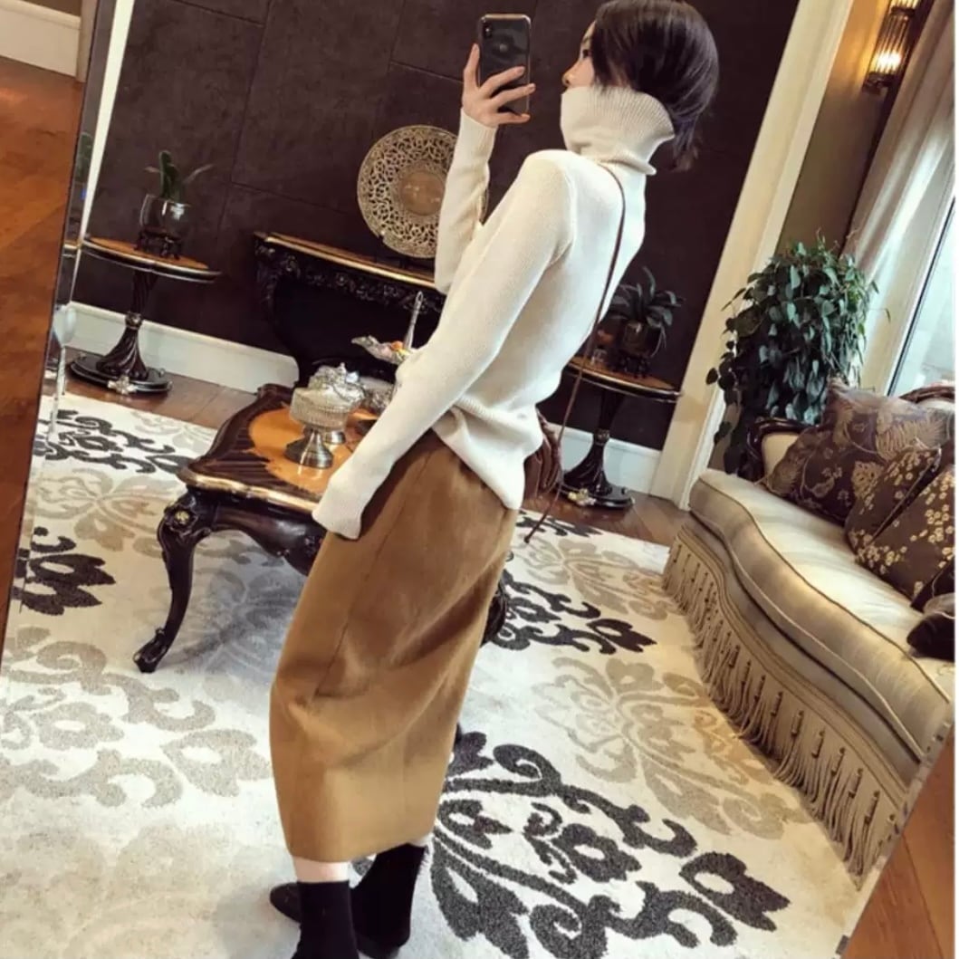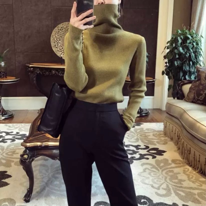 首元まであったかいタートルネックのニットセーターです。