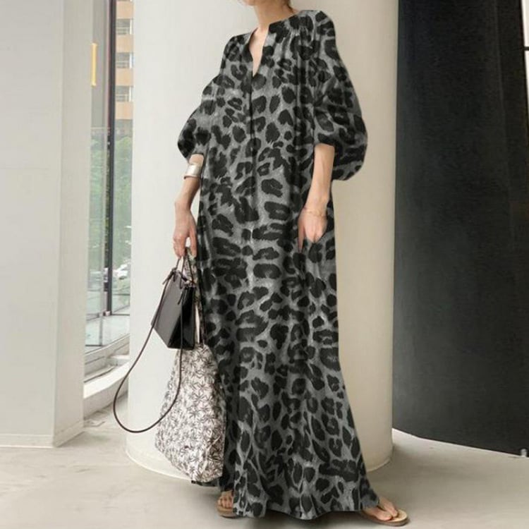 ロングワンピース レディース ワンピース 七分袖 五分袖 ロング マキシ丈 マキシ ヒョウ柄 豹柄 レオパード柄 Vネック パフスリーブ パフ袖 ボリューム袖 春 秋 デイリー 日常 普段着 普段使い かわいい 可愛いきれいめ 20代 30代 40代 50代 春 夏 大人 コーデ コーディネート 韓国 ファッション オルチャン お取り寄せ 送料無料 hll-0552