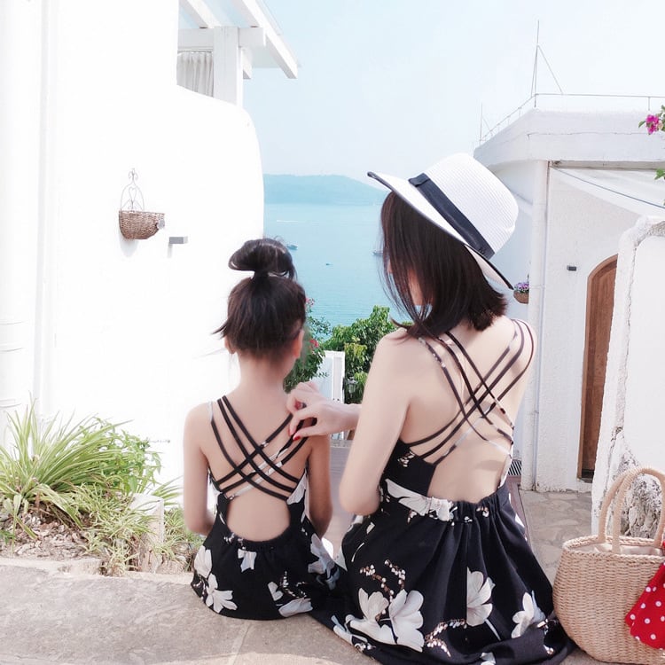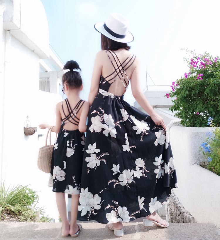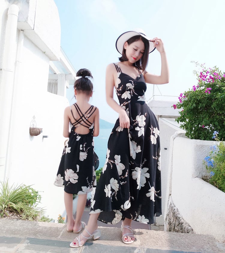 ワンピース サマーワンピース レディース ビーチスカート ロング丈 マキシ丈 ノースリーブ サスペンダー 花柄 親子 お揃い カジュアル レトロ エレガント 大人可愛い お洒落 大人 子供 夏 ブラック 黒 90 100 110 120 130 S M L 普段着 普段使い 日常使い お出かけ デート 海 バカンス リゾート 女子会 休日 コーデ コーディネート 韓国 ファッション お取り寄せ 送料無料 hll-0092