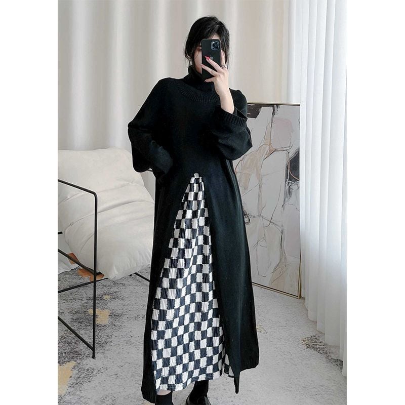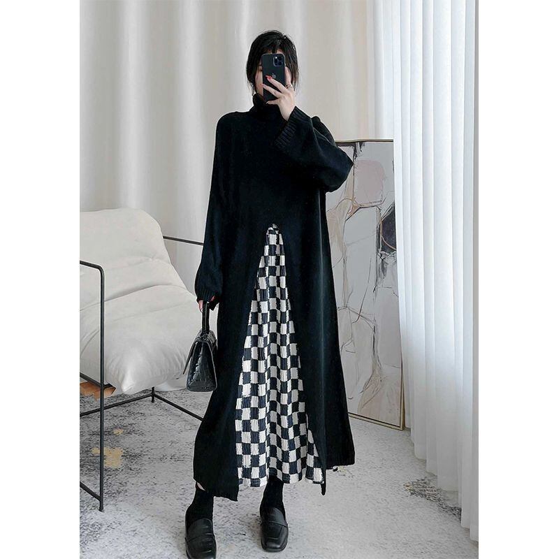 セットアップ レディース トップス ボトムス スカート ニット タートルネック 長袖 スリット ロング チェック ツーピース 2点セット 20代 30代 40代 秋 冬 日常 普段着 普段使い 仕事 仕事用 仕事着 大人 コーデ コーディネート 韓国 ファッション オルチャン お取り寄せ 送料無料 hll-1295