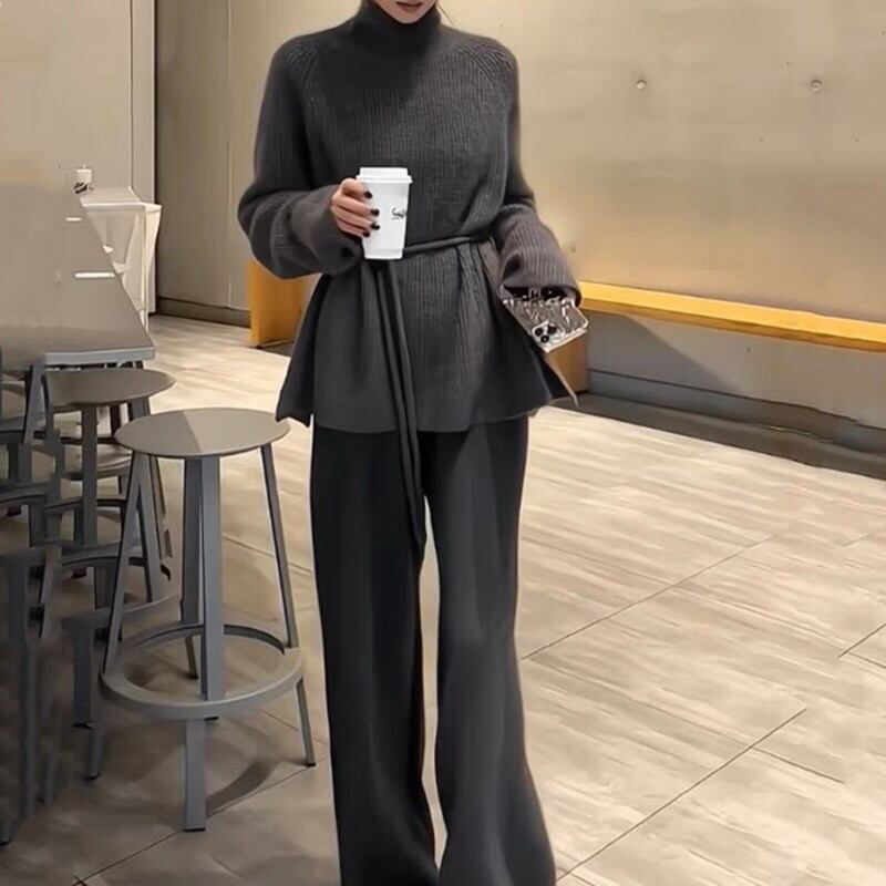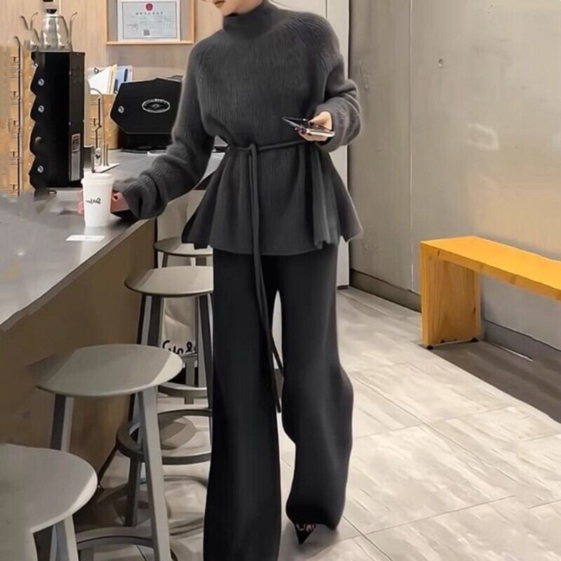 セットアップ レディース トップス ボトムス パンツ ワイド ニット セーター ハイネック 長袖 プルオーバー カジュアル スタイル シンプル 無地 きれいめ 上品 エレガント グレー ウエストマーク 日常使い 普段着 普段使い 仕事 仕事用 仕事着 大人 コーデ コーディネート 韓国 ファッション オルチャン お取り寄せ 送料無料 hll-1304