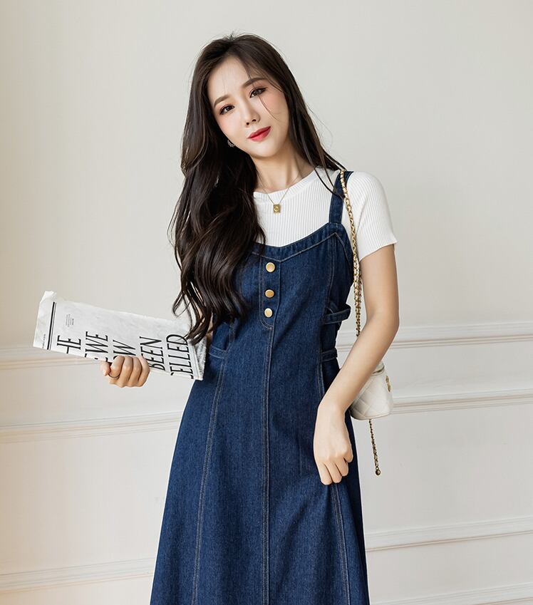 カジュアルなロング丈のサスペンダーデニムワンピースです。