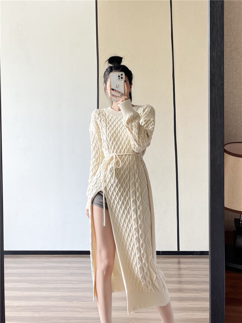 ワンピース ロング丈 レディース 長袖 ラウンドネック 無地 スリット スリム カジュアル レトロ エレガント 大人可愛い お洒落 大人 秋 冬 ホワイト 白 ワンサイズ 普段着 普段使い 日常使い お出かけ デート 女子会 休日 コーデ コーディネート 韓国 ファッション オルチャン お取り寄せ 送料無料 hll-0099