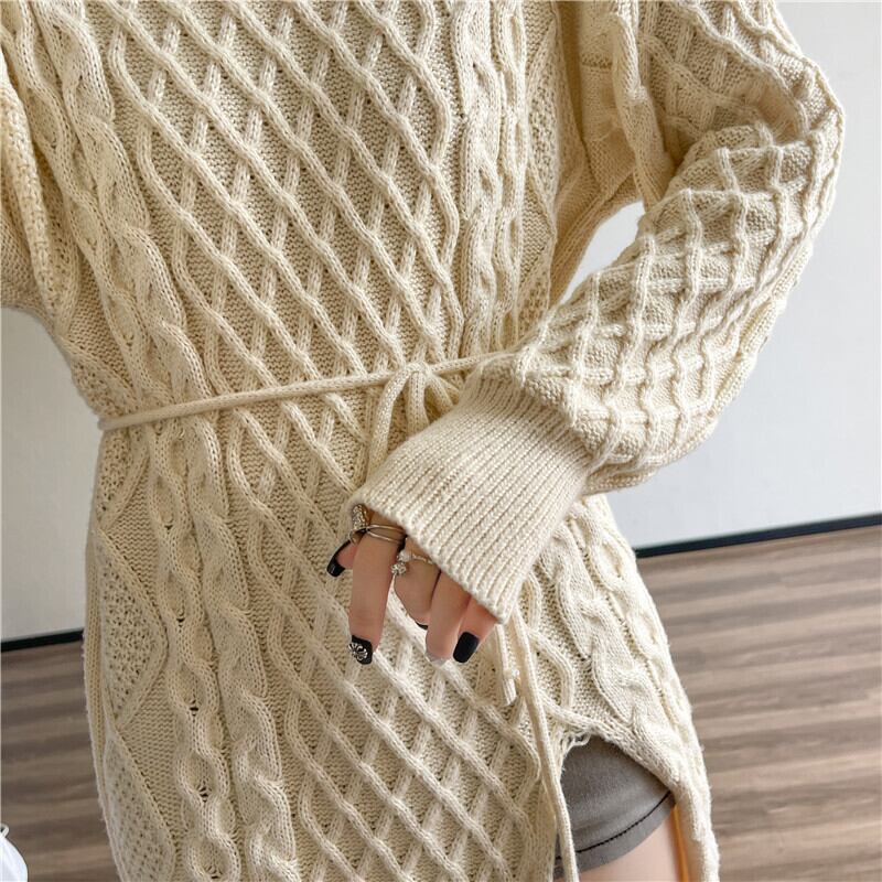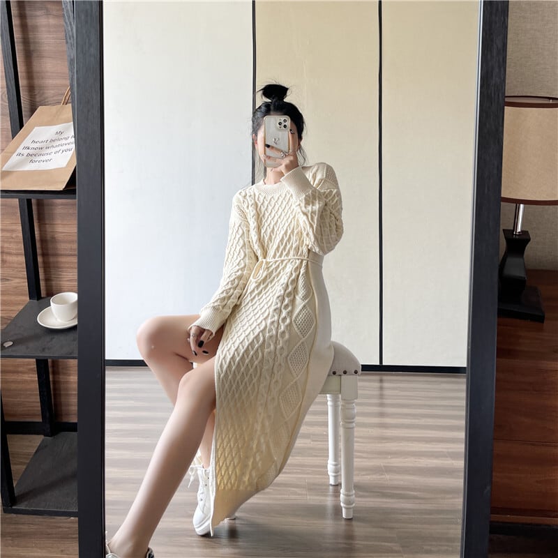 まるでワッフルかのような編み込みがかわいいロング丈の長袖ワンピースです。