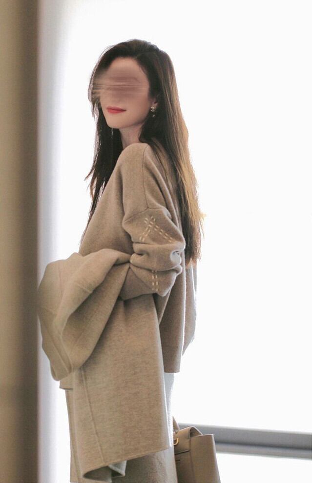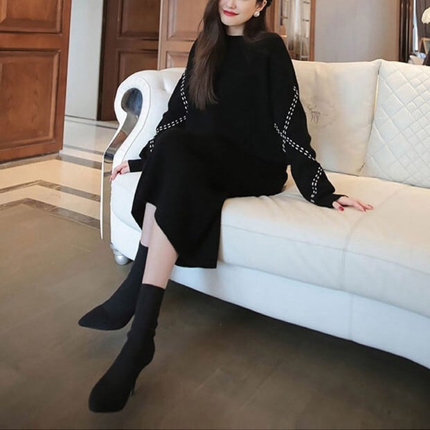 ルーズなニットセーターと膝下丈のニットスカートのセットアップです。