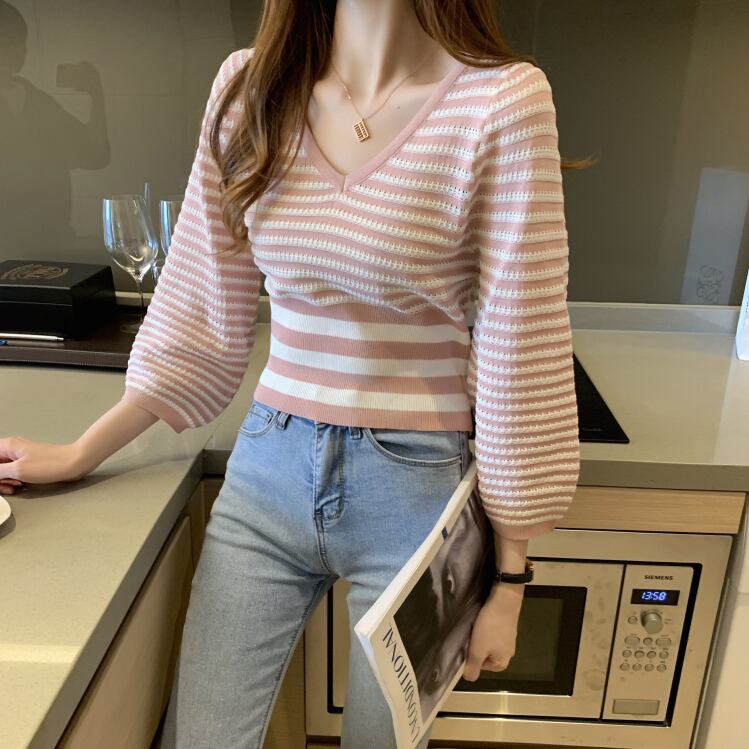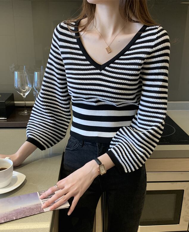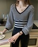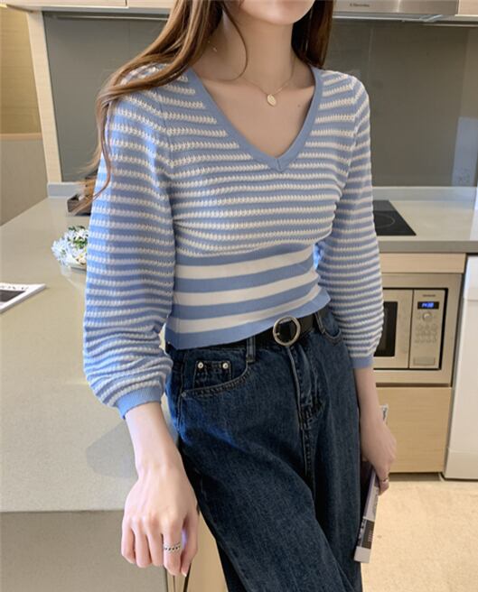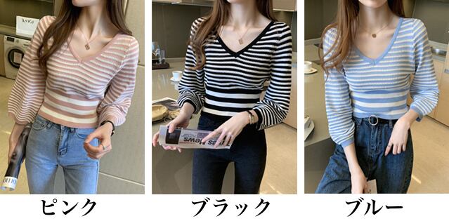 シャツ カットソー ボーダー柄 ショート丈 レディース トップス 長袖 Vネック プルオーバー タイト スリム レトロ カジュアル きれいめ 上品 清楚 お洒落 普段使い 普段着 日常使い お出かけ デート 女子会 春 秋 ブルー 青 ピンク ブラック 黒 ワンサイズ 10代 20代 30代 大人 大人かっこいい コーデ コーディネート 韓国 ファッション オルチャン お取り寄せ 送料無料 hll-0134