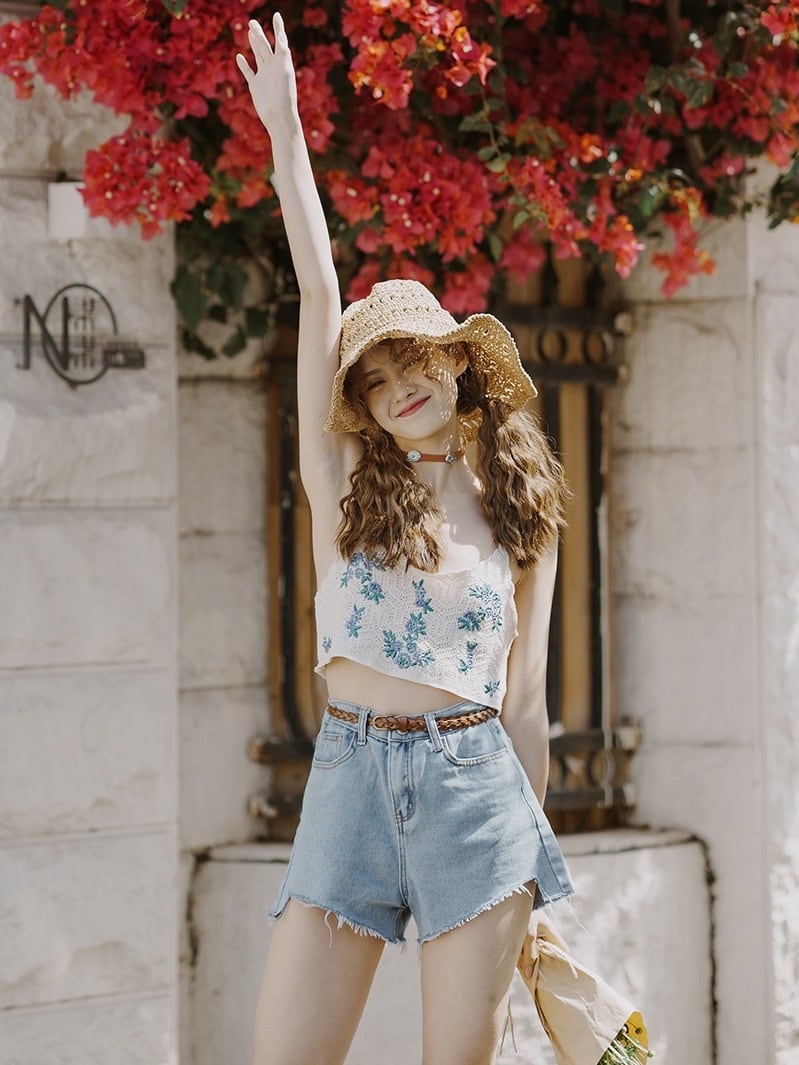 トップスをインすることでウエスト周りをすっきりとした印象に!