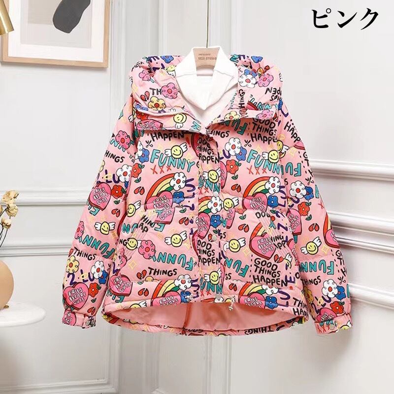 ジャケット ダウンジャケット ダウン アウター レディース 長袖 フードつき ジッパー ファスナー 前開き プリント イラスト レトロ カジュアル きれいめ 可愛い お洒落 普段使い 学生 通学 OL 通勤 普段着 日常使い お出かけ デート 女子会 冬 ホワイト 白 ピンク ブラック 黒 M L XL 10代 20代 大人 大人可愛い あったか コーデ コーディネート 韓国 ファッション オルチャン お取り寄せ 送料無料 hll-0160