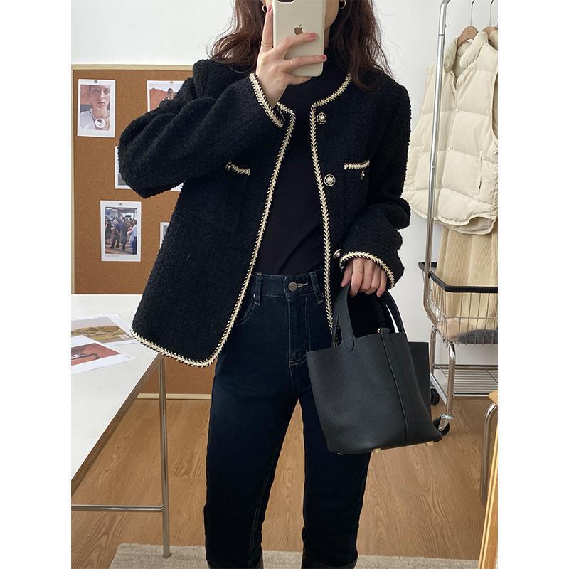 ノーカラージャケット トップス レディース 長袖 ノーカラー ジャケット ツイード 丸首 ゴールド ボタン きれいめ 上品 エレガント 通勤 通学 仕事 仕事用 仕事着 30代 40代 50代 春 秋 冬 入学式 卒業式 フォーマル セレモニー 黒 白 大人 コーデ コーディネート 韓国 ファッション オルチャン お取り寄せ 送料無料 hll-0572