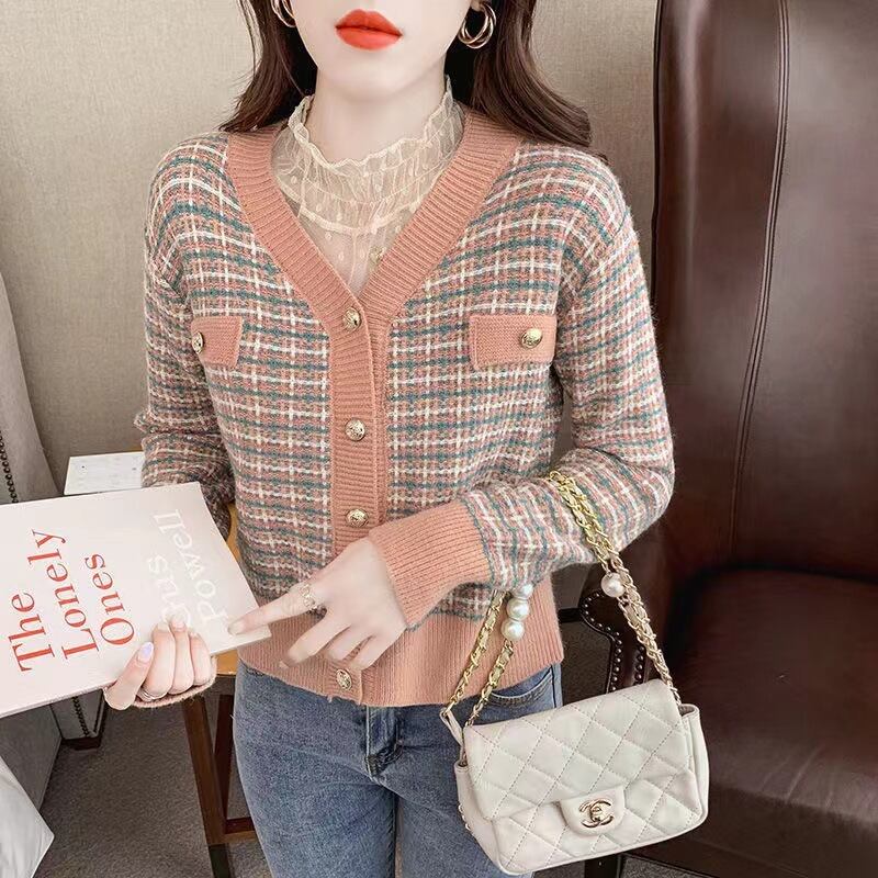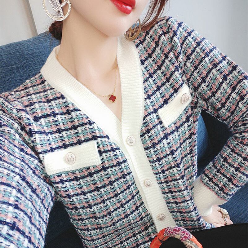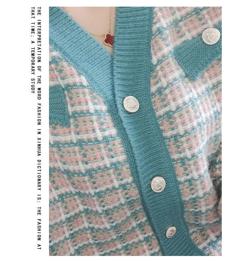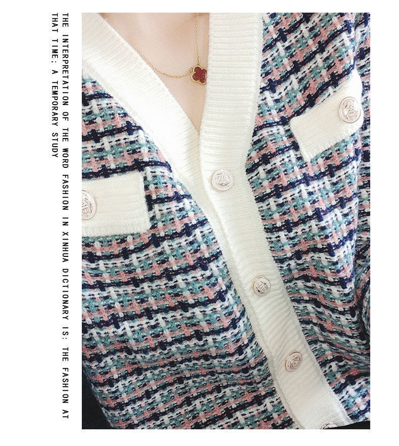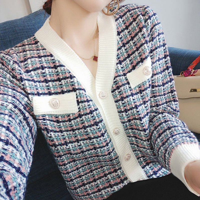 チェック柄ニットカーディガン レディース 長袖 カーディガン ニット チェック柄 Vネック ジャケット アウター トップス ボタン ショート ショート丈 カジュアル シンプル かわいい 可愛い 仕事 仕事用 仕事着 30代 40代 春 秋 冬 大人 コーデ コーディネート 韓国 ファッション オルチャン お取り寄せ 送料無料 hll-0573