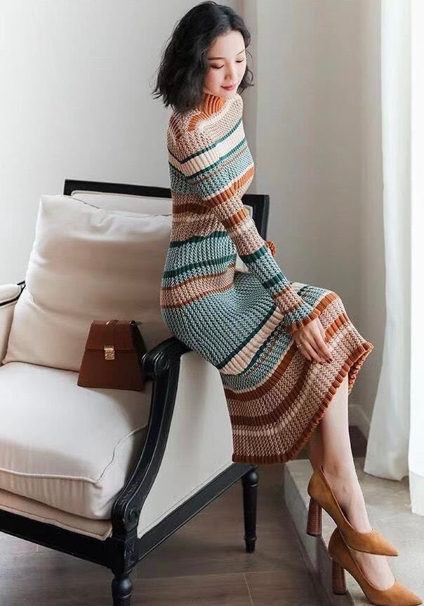 ワンピース ニットワンピース ニット セータースカート ミドル丈 レディース 長袖 ハイカラー ハイネック スリム ボーダー柄 シック レトロ カジュアル きれいめ 上品 清楚 お洒落 普段使い 普段着 日常使い お出かけ デート 女子会 秋 冬 キャメル ブルー 青 S M L XL 2XL 20代 30代 大人 大人かっこいい コーデ コーディネート 韓国 ファッション オルチャン お取り寄せ 送料無料 hll-0170