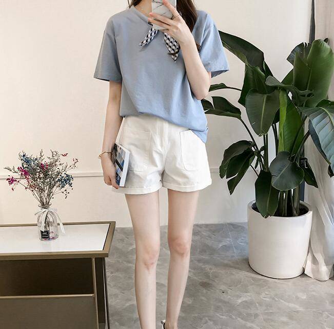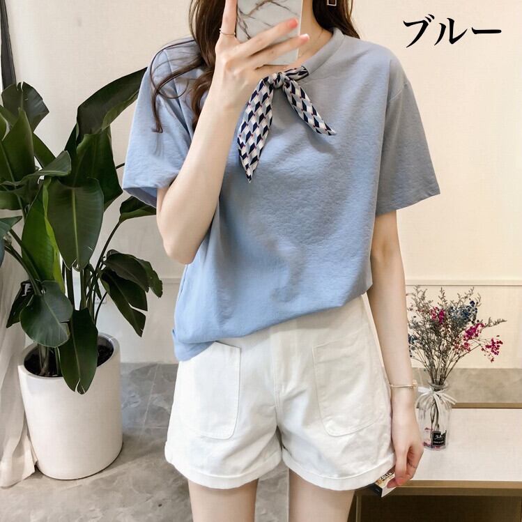 Tシャツ ブラウス レディース トップス 半袖 ネクタイ 蝶ネクタイ Vネック 薄手 無地 シンプル スリム シック レトロ カジュアル きれいめ 上品 清楚 お洒落 普段使い 普段着 日常使い お出かけ デート 女子会 夏 ホワイト 白 ブルー 青 S M L XL 10代 20代 30代 大人 大人かっこいい コーデ コーディネート 韓国 ファッション オルチャン お取り寄せ 送料無料 hll-0184
