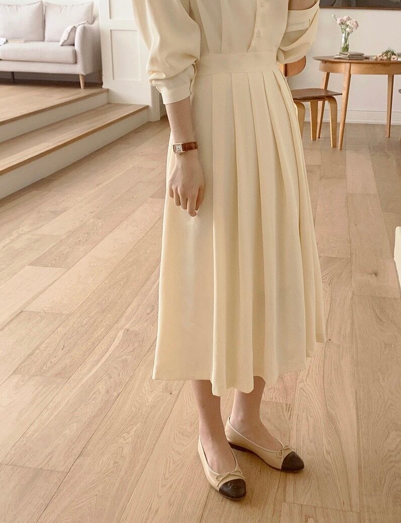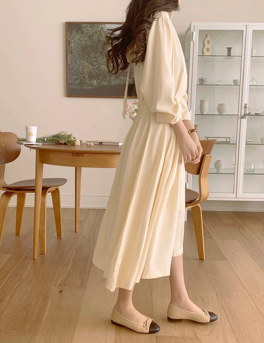 ふわふわしたフェミニンな印象のミドル丈長袖ワンピースです。