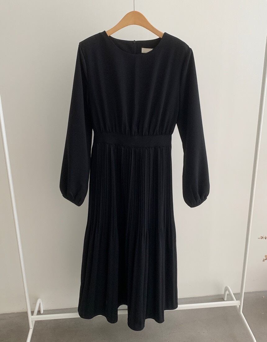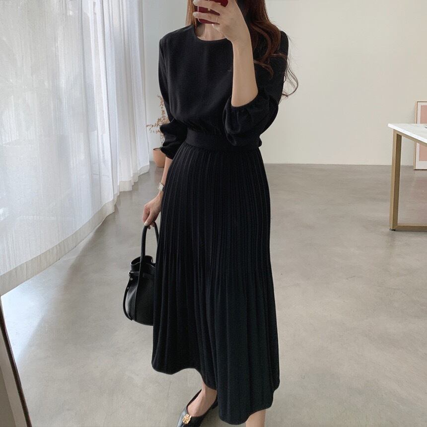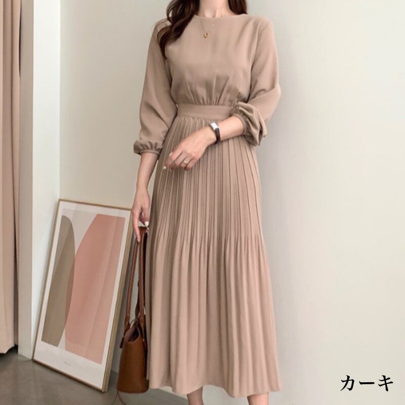 ワンピース プリーツスカート プリーツ ミドル丈 レディース 長袖 ラウンドネック プルオーバー 無地 ハイウエスト スリム 清楚 上品 フェミニン 大人女子 大人かっこいい お洒落 エレガント 秋 カーキ ブラック 黒 20代 30代 お出かけ お呼ばれ 女子会 大人 コーデ コーディネート 韓国 ファッション オルチャン お取り寄せ 送料無料 hll-0201