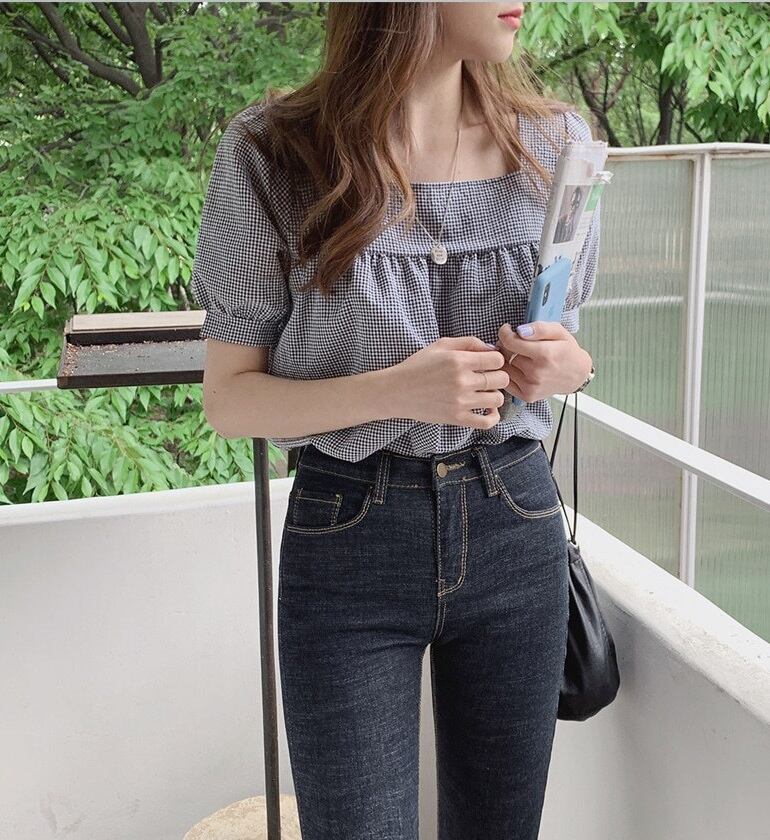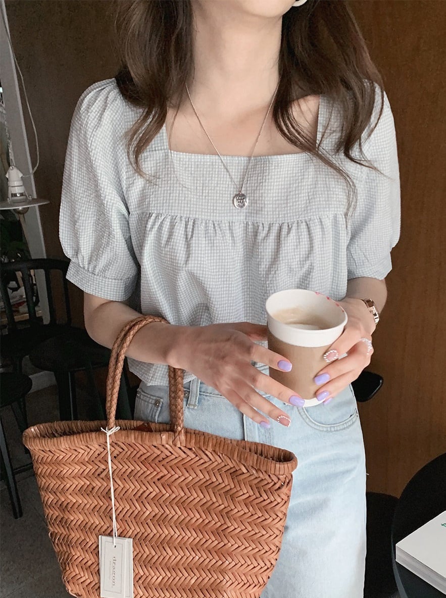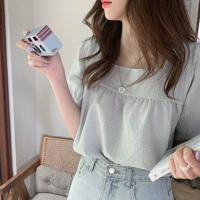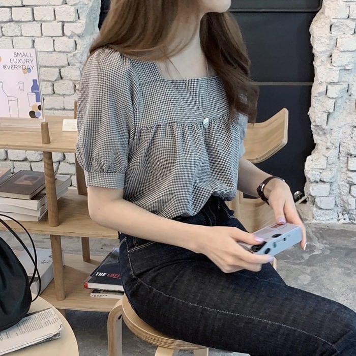 半袖ブラウス レディース トップス 半袖 ブラウス パフ袖 パフスリーブ スクエアネック チェック ギンガムチェック かわいい 可愛い カジュアル シンプル 日常 デイリー お出かけ デート 10代 20代 30代 春 夏 大人 コーデ コーディネート 韓国 ファッション オルチャン お取り寄せ 送料無料 ll-0582