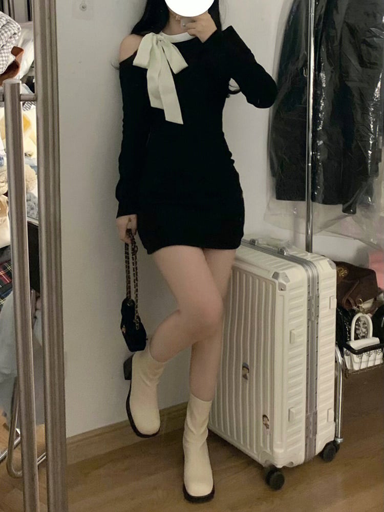 ミニワンピース レディース ワンピース ミニ ミニ丈 ドレス ショート ショート丈 長袖 リボン ワンショルダー タイト 細身 バイカラー 配色 黒 白 かわいい 可愛い 日常 デート お出かけ 10代 20代 春 秋 冬 大人 コーデ コーディネート 韓国 ファッション オルチャン お取り寄せ 送料無料 hll-0584