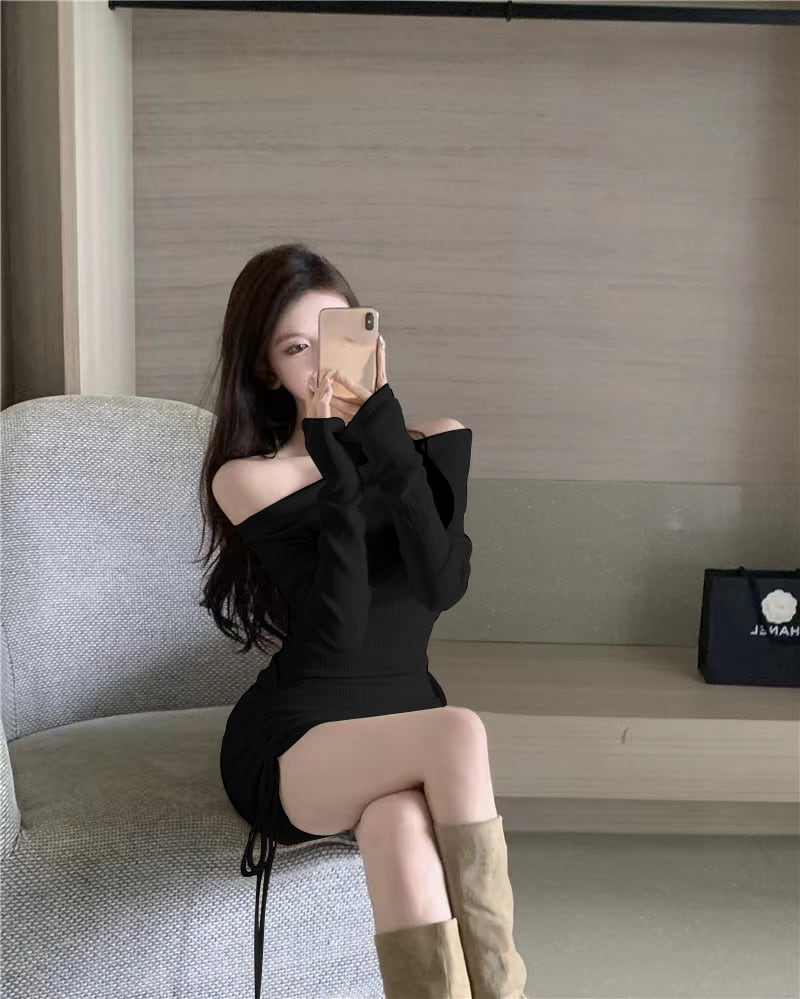 ミニワンピース レディース ワンピース ミニ ミニ丈 オフショルダー ショートショート丈 黒 白 長袖 タイト 細身 無地 きれいめ 上品 セクシー 日常 デート お出かけ 10代 20代 春 秋 冬 大人 コーデ コーディネート 韓国 ファッション オルチャン お取り寄せ 送料無料 hll-0585
