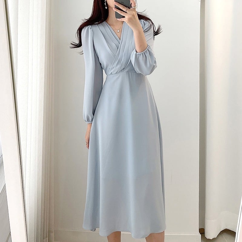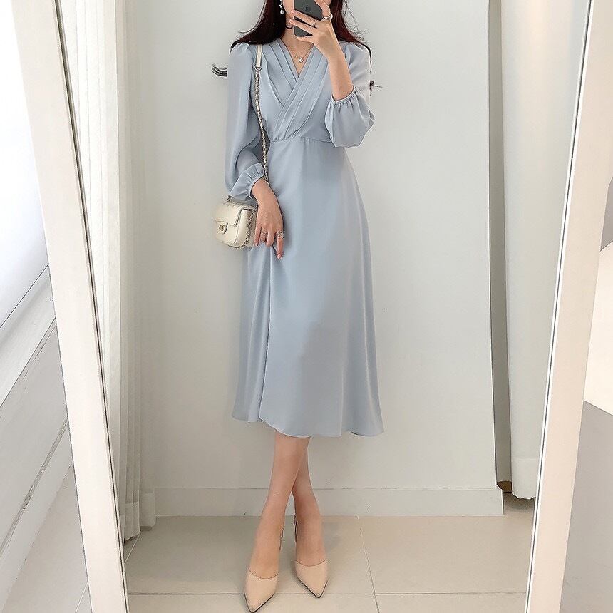ワンピース シフォンワンピース シフォン プリーツ ミドル丈 膝丈 レディース 長袖 Vネック 無地 ハイウエスト スリム 清楚 上品 フェミニン 大人女子 大人かっこいい お洒落 エレガント 秋 アプリコット ブルー 青 ワンサイズ 20代 30代 お出かけ お呼ばれ 女子会 大人 コーデ コーディネート 韓国 ファッション オルチャン お取り寄せ 送料無料 hll-0204