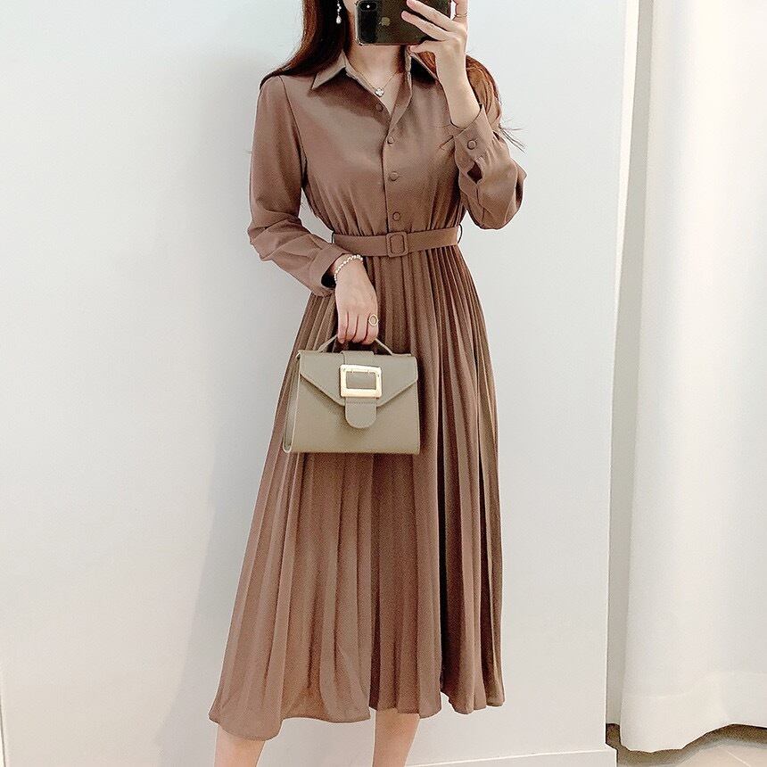 ワンピース シャツワンピース プリーツスカート プリーツ ミドル丈 レディース 長袖 襟付き ポロカラー ボタン ベルト 無地 ハイウエスト スリム 清楚 上品 フェミニン 大人女子 大人かっこいい お洒落 エレガント 秋 冬 アプリコット ブラウン 茶色 20代 30代 お出かけ お呼ばれ 女子会 大人 コーデ コーディネート 韓国 ファッション オルチャン お取り寄せ 送料無料 hll-0215