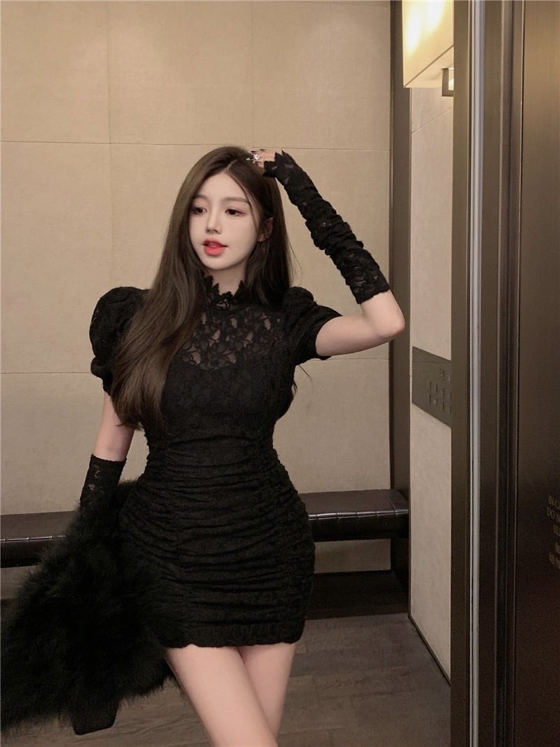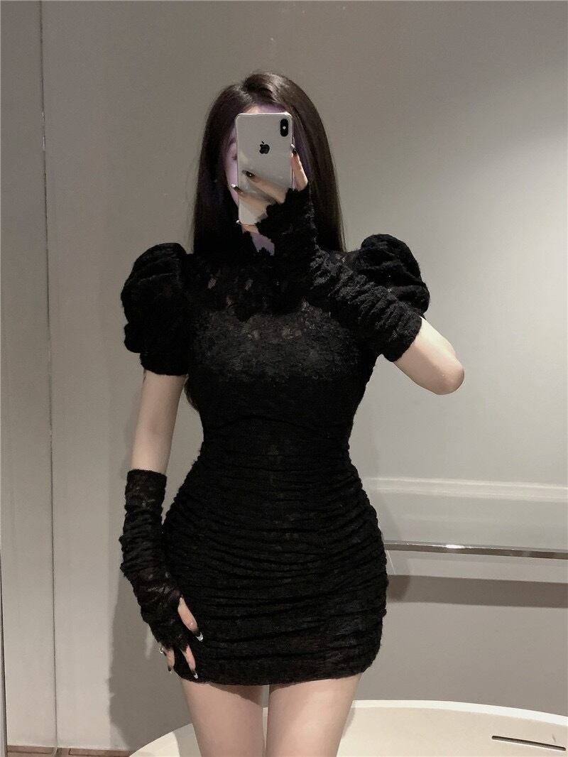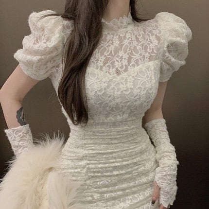 パーティードレス レースドレス レース プリーツ ドレス ショート丈 レディース 半袖 パフスリーブ ハイカラー 透け感 ハイウエスト スリム セクシー レトロ エレガント 大人可愛い お洒落 大人 春 夏 ホワイト 白 S M L 10代 20代 30代 お呼ばれ パーティー 結婚式 二次会 披露宴 コーデ コーディネート 韓国 ファッション オルチャン インスタ映え お取り寄せ 送料無料 hll-0221