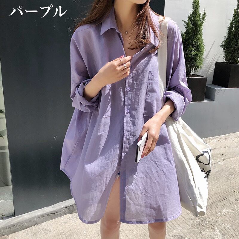 シャツ ロングシャツ レディース トップス 長袖 襟付き ポロカラー ボタン 前開き 日焼け止め 無地 シンプル ルーズ レトロ カジュアル きれいめ 上品 清楚 お洒落 普段使い 普段着 日常使い お出かけ デート 女子会 休日 夏 ホワイト 白 パープル 紫 S M L XL 2XL 10代 20代 30代 大人 大人かっこいい コーデ コーディネート 韓国 ファッション オルチャン お取り寄せ 送料無料 hll-0257