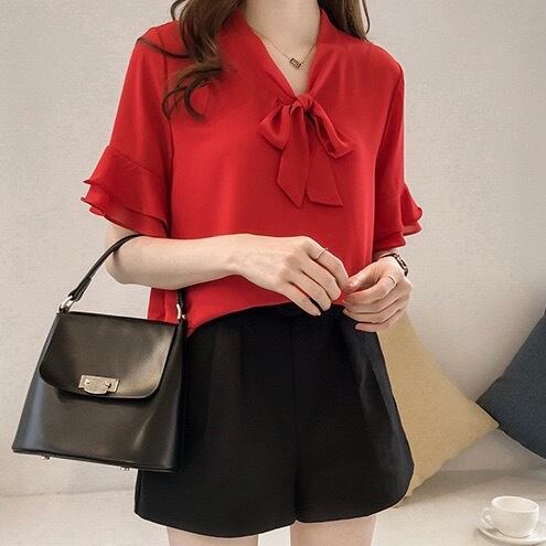 シャツ ブラウス シフォンシャツ シフォン レディース トップス 半袖 Vネック フリル リボン プルオーバー 無地 シンプル ルーズ レトロ カジュアル きれいめ 上品 清楚 お洒落 普段使い 普段着 日常使い お出かけ デート 女子会 休日 夏 ホワイト 白 アプリコット レッド 赤 M L XL 2XL 3XL 4XL ラージサイズ 10代 20代 大人 大人かっこいい コーデ コーディネート 韓国 ファッション オルチャン お取り寄せ 送料無料 hll-0258