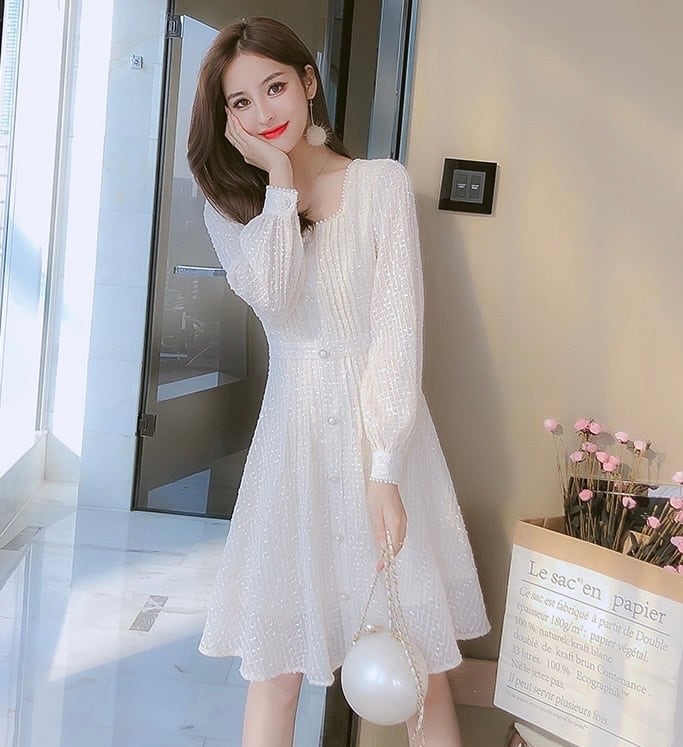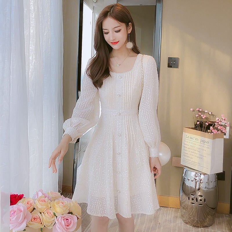 ワンピース シャツワンピース フレアワンピース ミドル丈 膝丈 レディース 長袖 パフスリーブ ラウンドネック ボタン ハイウエスト スリム フェミニン 大人女子 大人かっこいい お洒落 エレガント 秋 アプリコット S M L XL 10代 20代 お出かけ 普段使い 普段着 日常使い 女子会 大人 コーデ コーディネート 韓国 ファッション オルチャン お取り寄せ 送料無料 hll-0269
