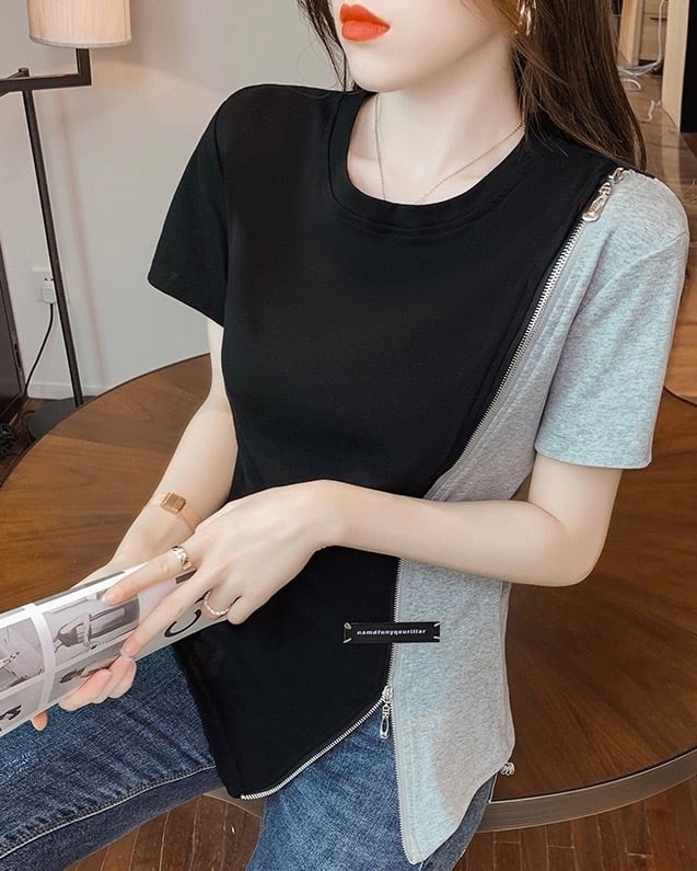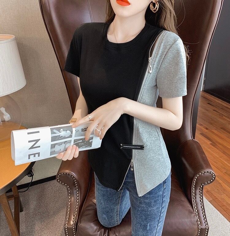 Tシャツ レディース トップス 半袖 ラウンドネック ジッパー ファスナー スリム レトロ カジュアル きれいめ 上品 清楚 お洒落 普段使い 普段着 日常使い お出かけ デート 女子会 休日 夏 ホワイト 白 グレー 灰色 S M L XL 10代 20代 大人 大人かっこいい コーデ コーディネート 韓国 ファッション オルチャン お取り寄せ 送料無料 hll-0270