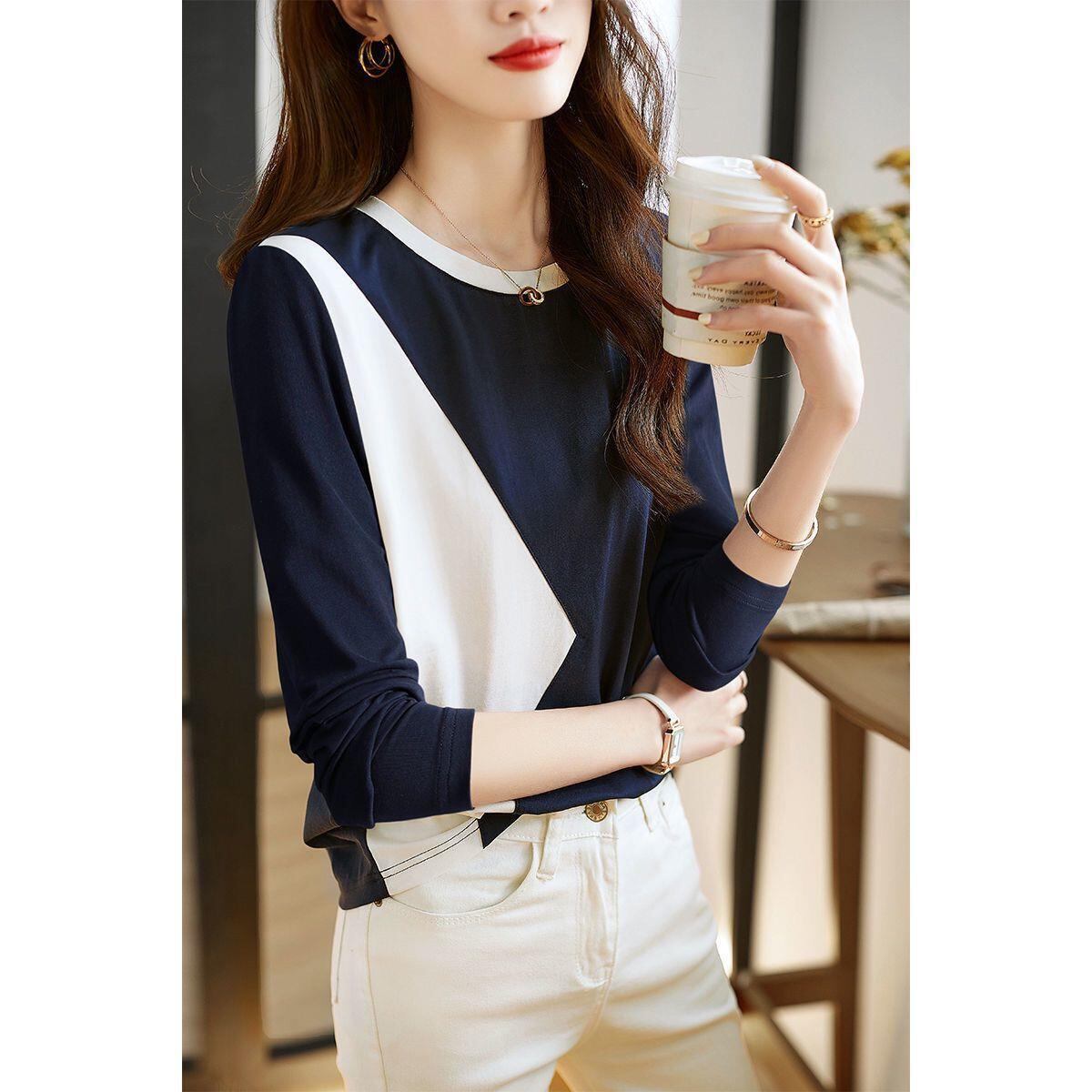 カットソー レディース トップス 長袖 ラウンドネック ネイビー 白 ホワイト きれいめ バイカラー ツートンカラー 配色 おしゃれ 仕事 仕事用 仕事着 20代 30代 40代 春 秋 大人 コーデ コーディネート 韓国 ファッション オルチャン お取り寄せ 送料無料 hll-0622