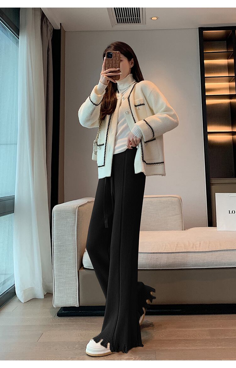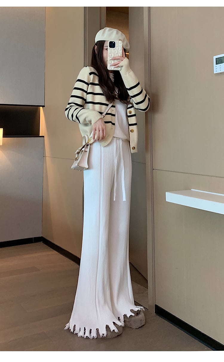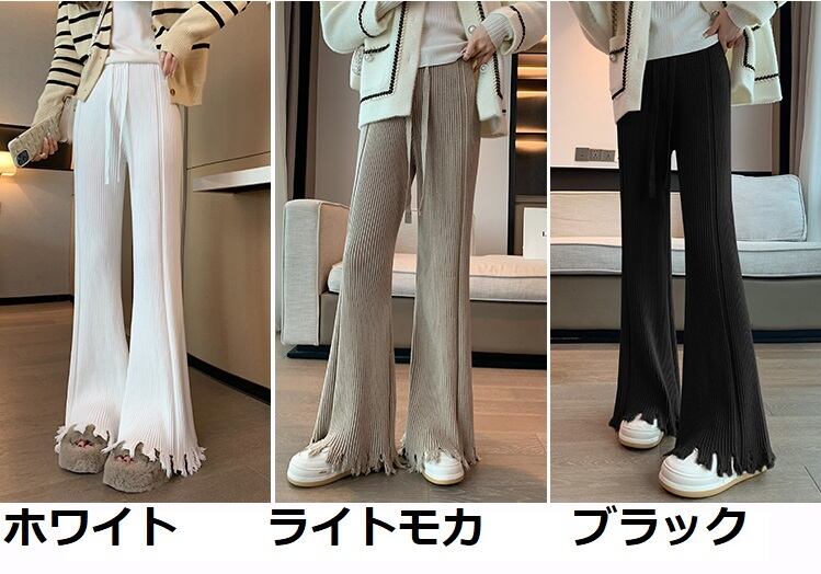 フレアリブニット レディース ボトムス パンツ リブ フレア フリンジ ダメージ ニット ウエストゴム ワイド かわいい 可愛い 日常 デート お出かけ 部屋着 ルームウェア 黒 白 秋 冬10代 20代 30代 40代 大人 コーデ コーディネート 韓国 ファッション オルチャンお 取り寄せ 送料無料 hll-0623