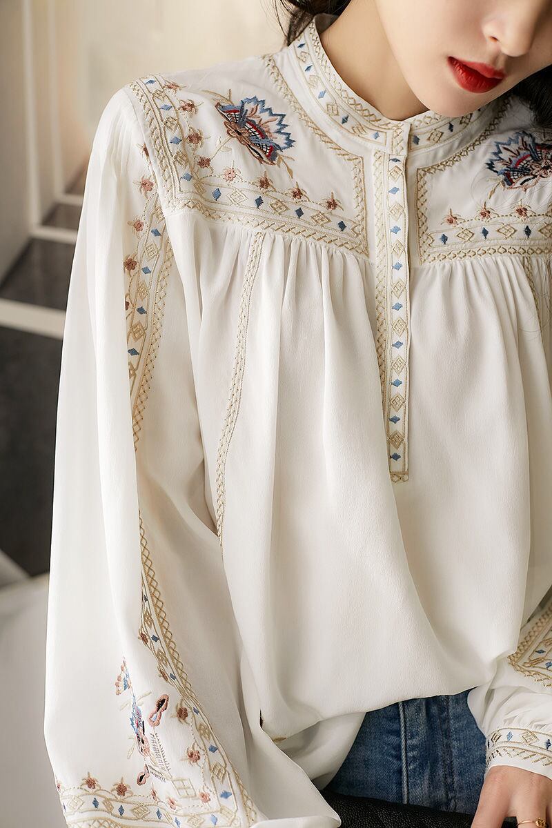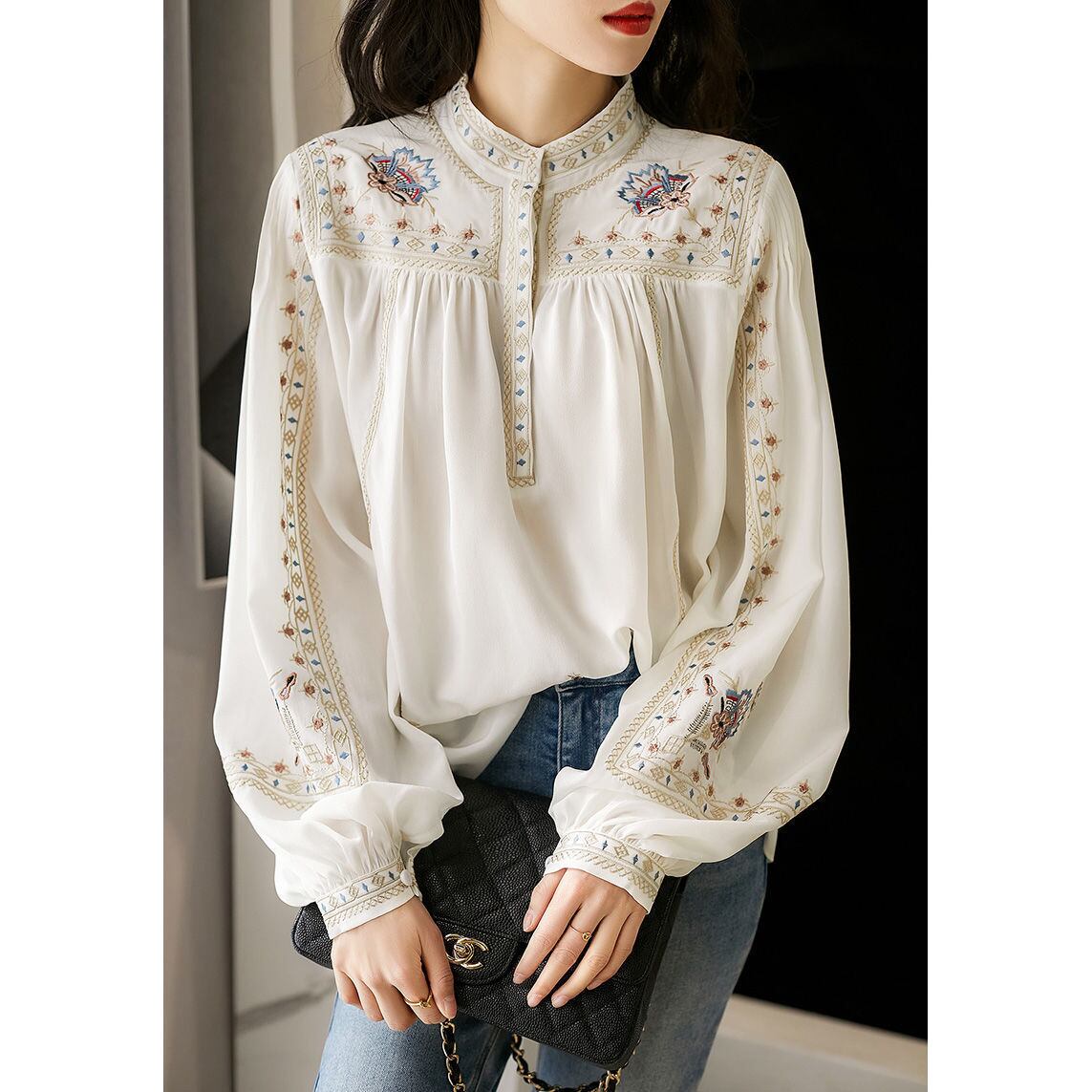 ブラウス レディース トップス シャツ スタンドカラー シフォン ボリューム袖 ボタン ホワイト 白 刺繍 ボタニカル 長袖 きれいめ 上品 エレガント 日常 仕事 仕事用 仕事着 デート 春 秋 20代 30代 40代 大人 コーデ コーディネート 韓国 ファッション オルチャン お取り寄せ 送料無料 hll-0624