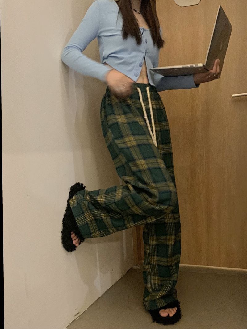チェック柄パンツ レディース ボトムス パンツ ワイドパンツ ワイド ウエストゴム チェック 赤 緑 カジュアル 日常 デート お出かけ 10代 20代 大人 コーデ コーディネート 韓国 ファッション オルチャン お取り寄せ 送料無料 hll-0626