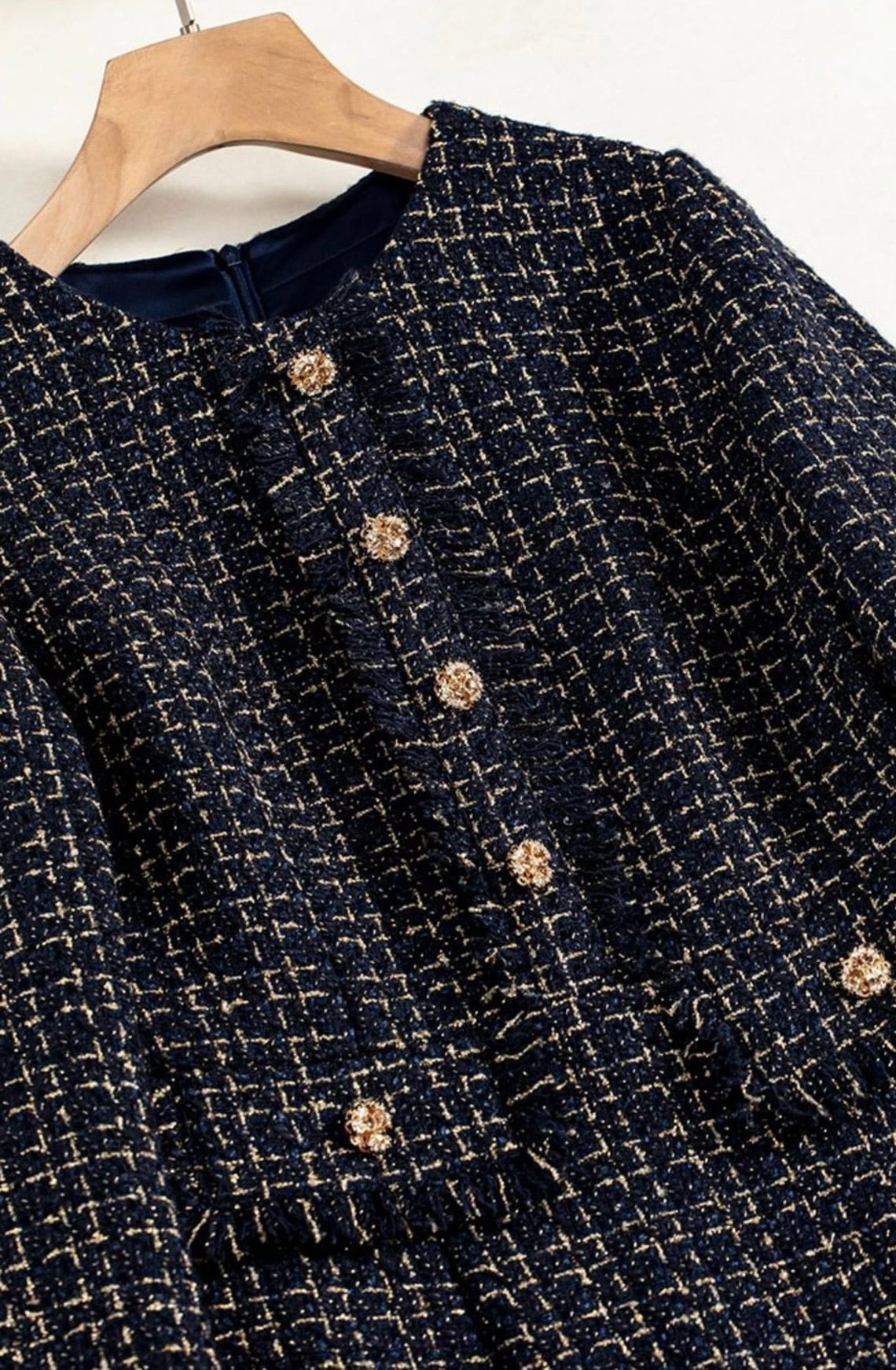 ワンピース 膝丈スカート 膝丈 ツイードワンピース ツイード柄 レディース 長袖 ラウンドネック Aラインスカート プルオーバー ハイウエスト スリム 大人女子 大人かっこいい お洒落 エレガント 秋 ネイビー 紺 20代 30代 S M L XL お出かけ お呼ばれ 女子会 デート 大人 コーデ コーディネート 韓国 ファッション オルチャン お取り寄せ 送料無料 hll-0303