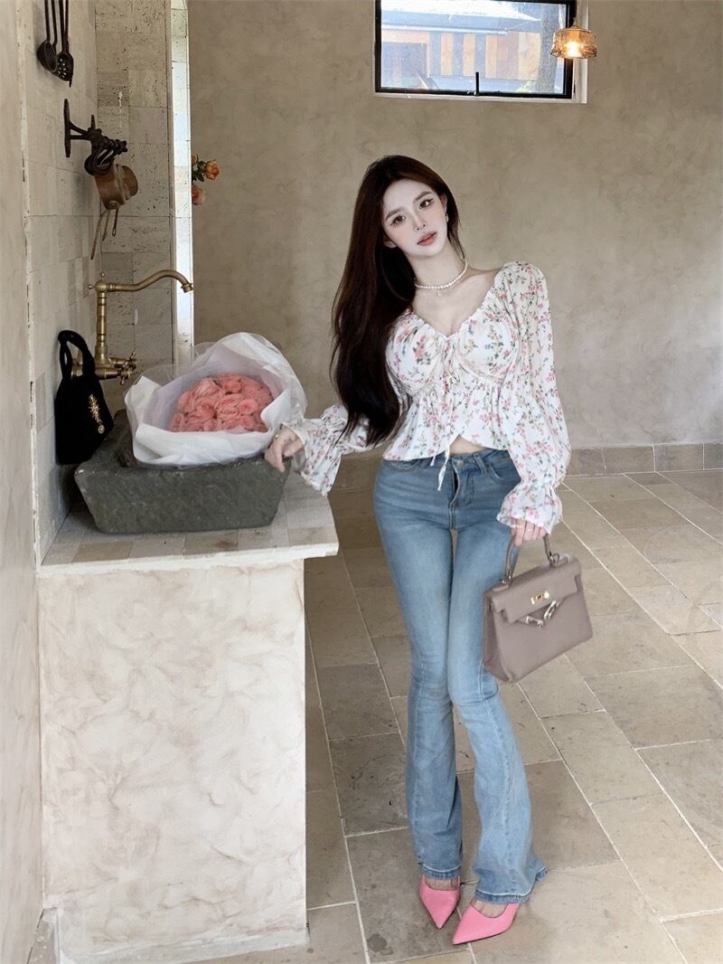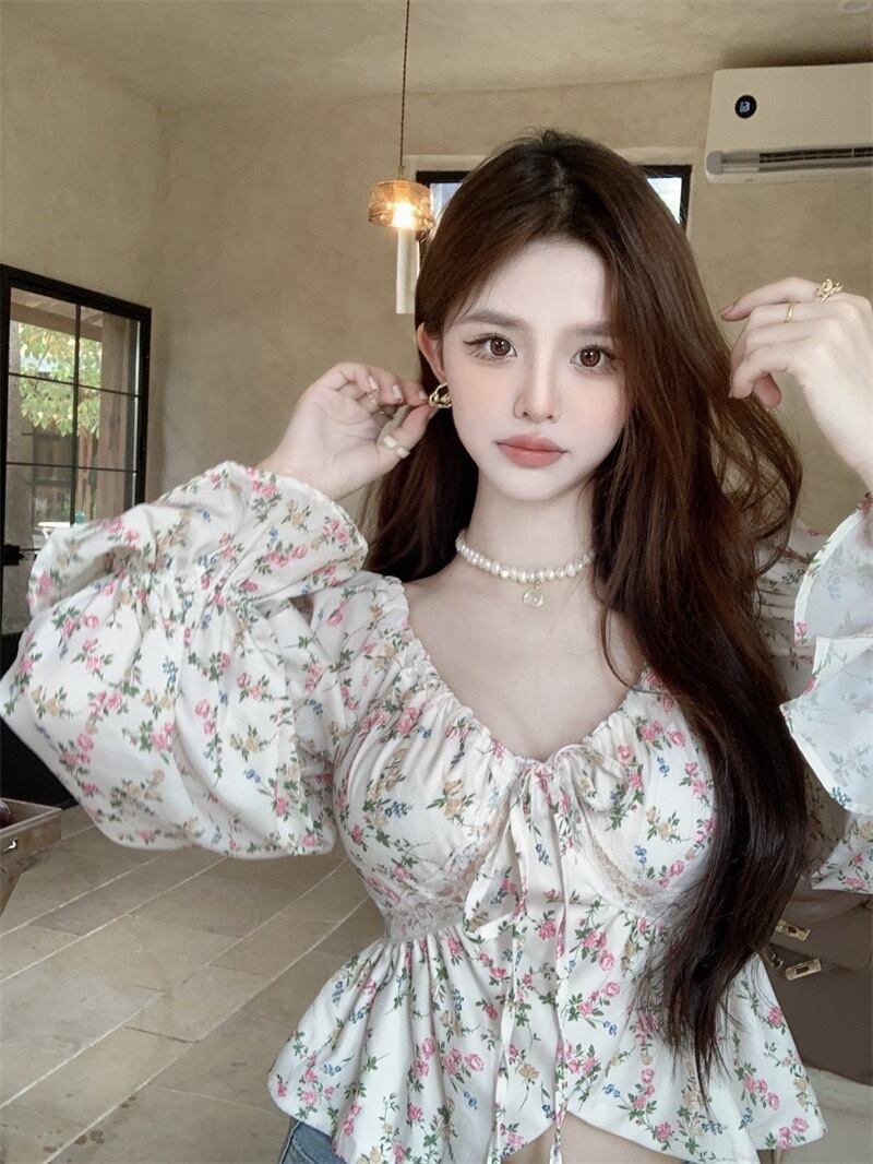 全体にプリントされた花柄がキュートなショート丈の長袖シャツです。