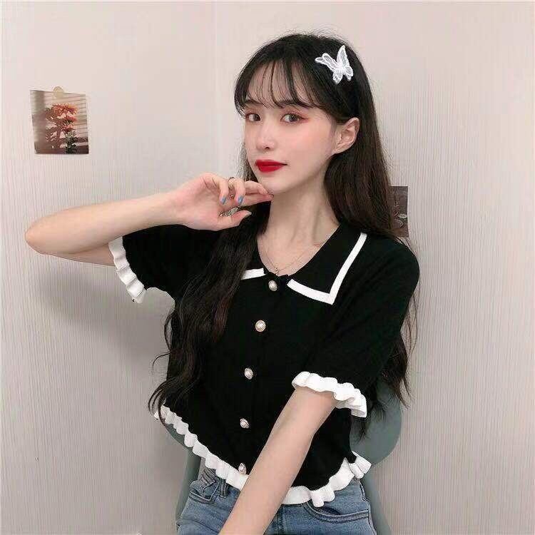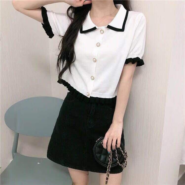 シャツ ニットシャツ ニット ショート丈 レディース トップス 半袖 襟付き ポロカラー ボタン 前開き スリム カジュアル きれいめ 上品 お洒落 日常使い 普段着 普段使い デート お出かけ 女子会 休日 夏 ホワイト 白 ブラック 黒 ワンサイズ 10代 20代 30代 大人 コーデ コーディネート 韓国 ファッション オルチャン お取り寄せ 送料無料 hll-0350