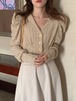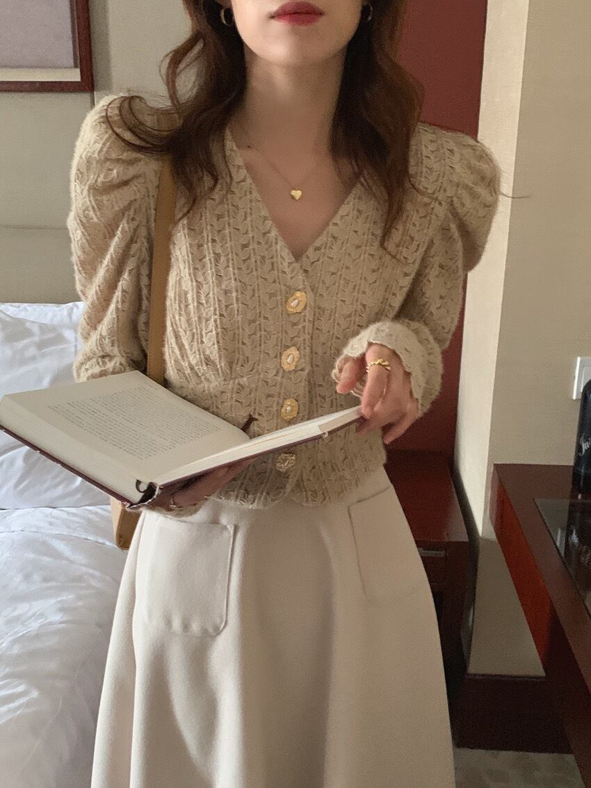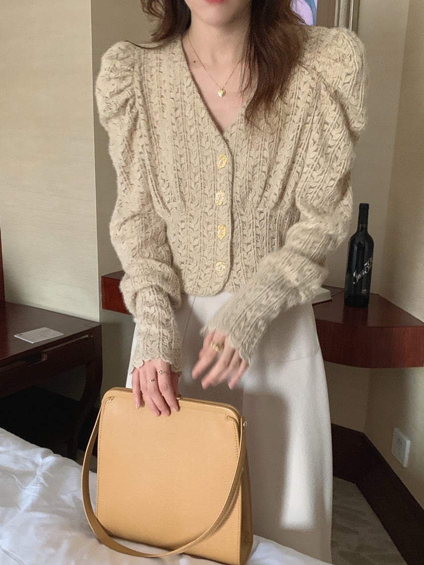シャツ レースシャツ レース スカート ウール レディース トップス ボトムス 長袖 パフスリーブ Vネック ボタン 前開き ポケット スリム カジュアル きれいめ 上品 お洒落 日常使い 普段着 普段使い デート お出かけ 女子会 休日 秋 冬 アプリコット ワンサイズ S M 10代 20代 30代 大人 コーデ コーディネート 韓国 ファッション オルチャン お取り寄せ 送料無料 hll-0351