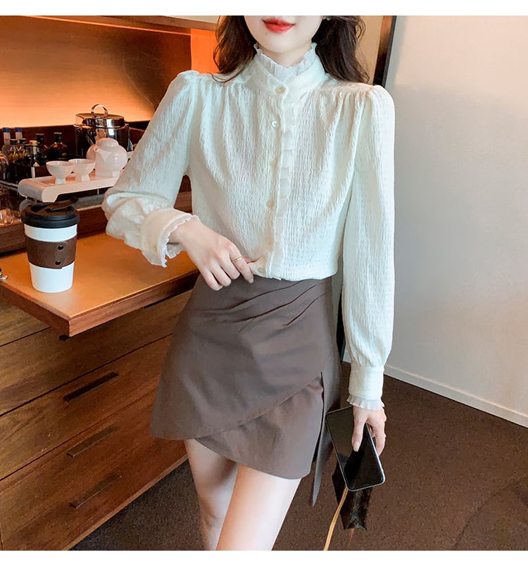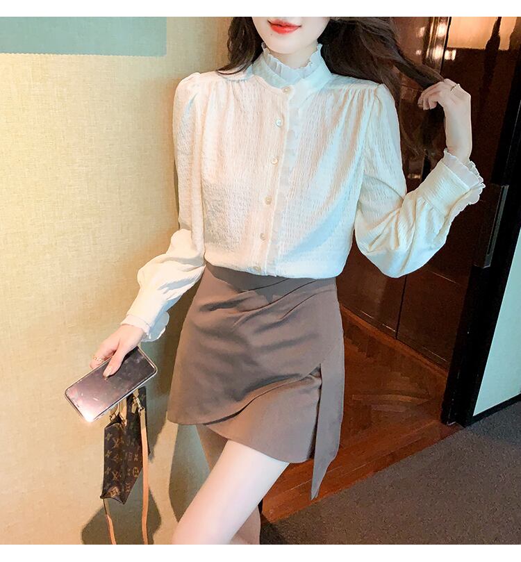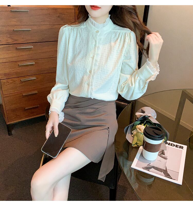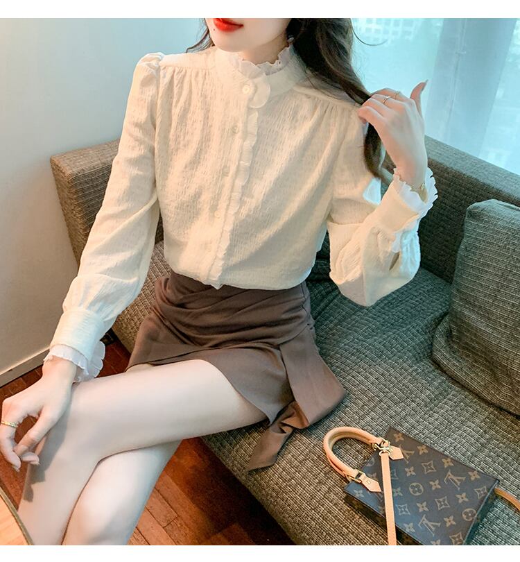 フリルシャツ レディース トップス シャツ フリル レース スタンドカラー 長袖 きれいめ 上品 仕事 仕事用 仕事着 20代 30代 春 秋 白 大人 コーデ コーディネート 韓国 ファッション オルチャン お取り寄せ 送料無料 hll-0663