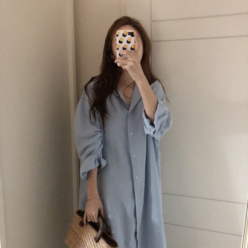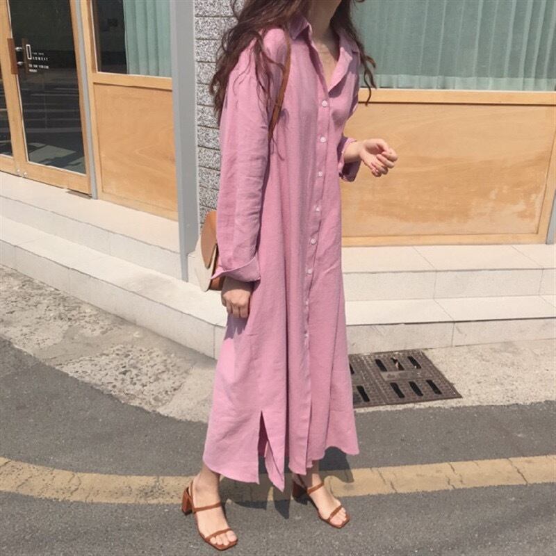 ワンピース シャツワンピース ロングスカート ロング丈 レディース 長袖 襟付き ポロカラー ボタン 前開き 薄手 無地 ルーズ 大人女子 大人かっこいい お洒落 エレガント 夏 ホワイト 白 ブルー 青 ピンク カーキ ネイビー 紺 S M L 10代 20代 30代 お出かけ 普段使い 普段着 日常使い 休日 部屋着 大人 コーデ コーディネート 韓国 ファッション オルチャン お取り寄せ 送料無料 hll-0373